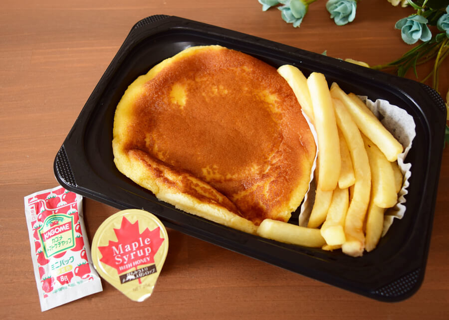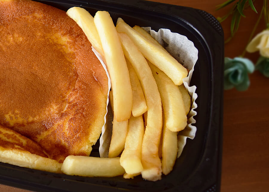 無理やり容器につめられている大きなパンケーキにフライドポテト、はちみつ入りのメイプルシロップ・トマトケチャップが付いている一品。ファミリーレストランとしてはお買い得な持ち帰り品ではないでしょうか。