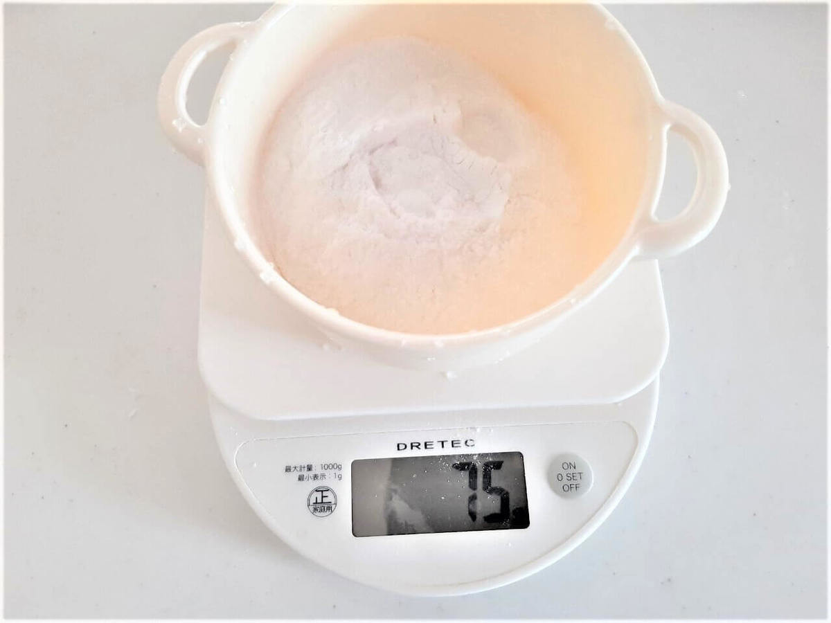 今回は小さめサイズにするので半量の75gの粉にしました。水も半量の約65mlです。