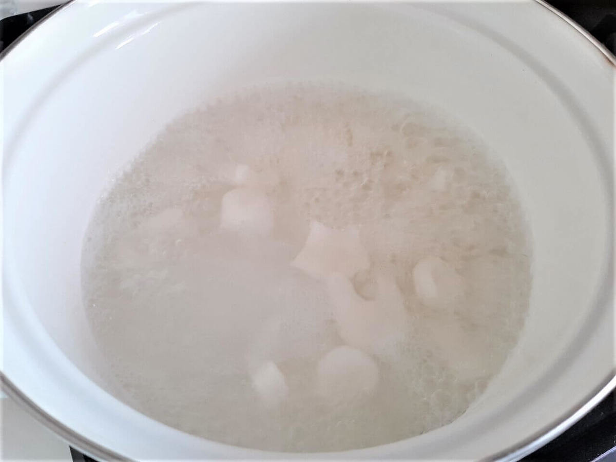 沸騰したお湯に作ったおだんごを投入。表面に浮いてきてから約2分であげましょう。