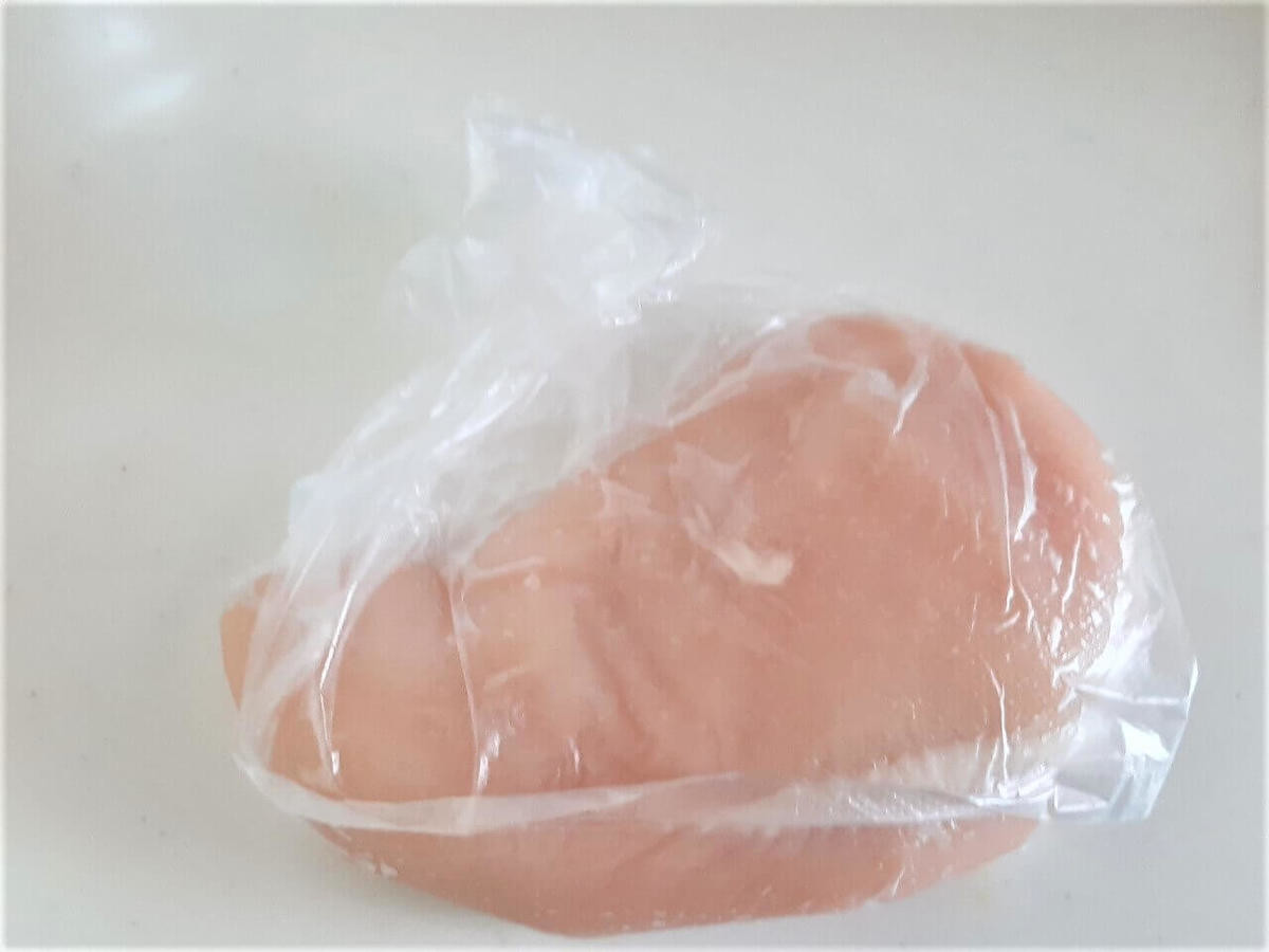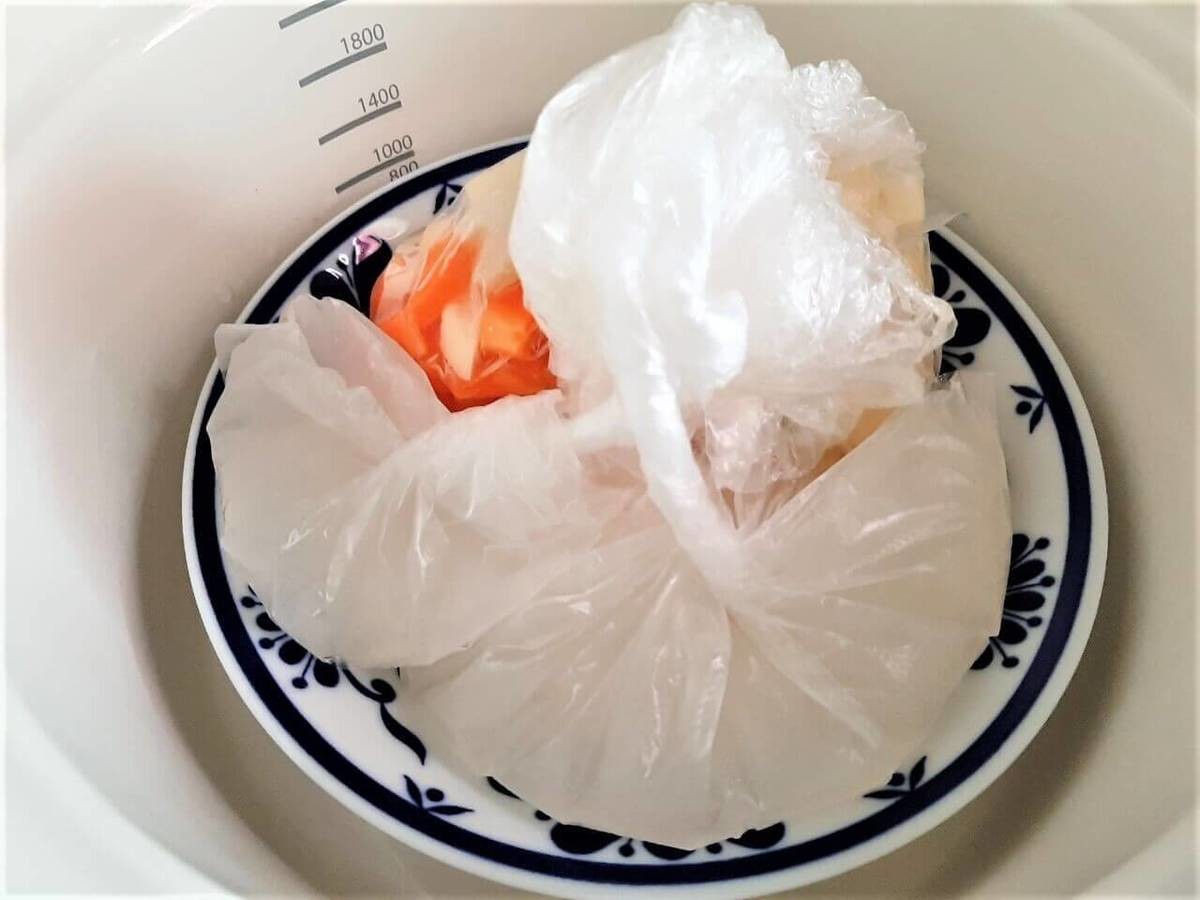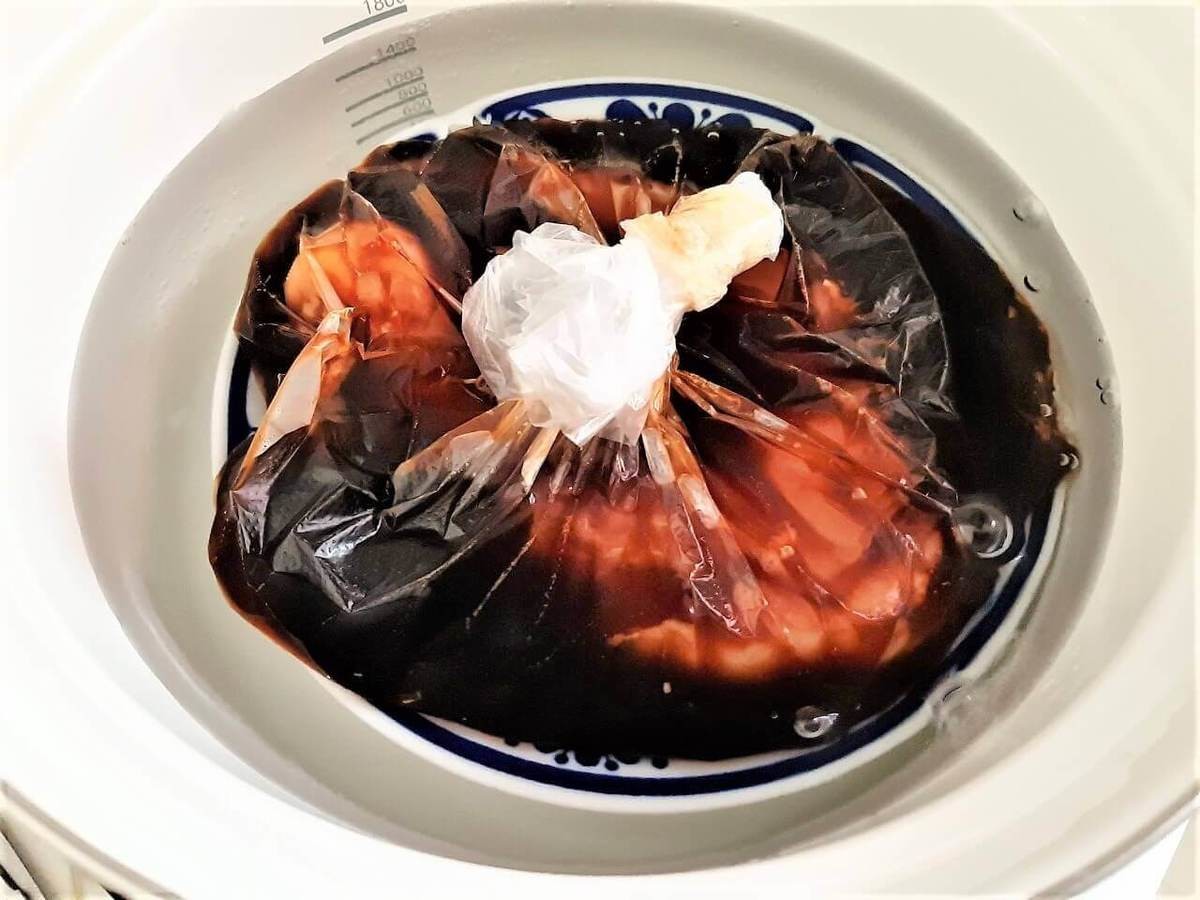 作り方は簡単。キッチンパックに鶏肉と醤油やみりんなどの調味料を入れて湯煎調理します。必ず皿の上にのせて湯煎してくださいね。