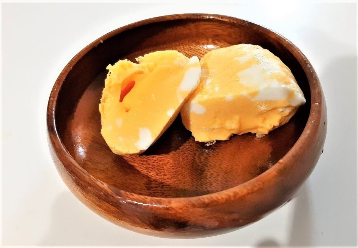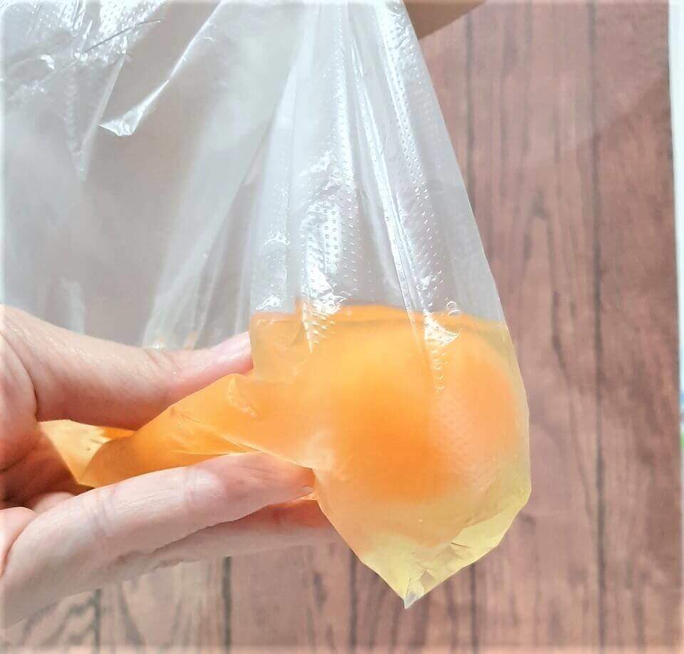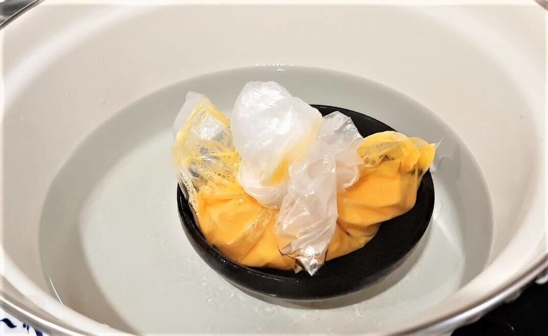 卵も湯煎調理してみます。まずはキッチンパックに直接卵を割り入れます。