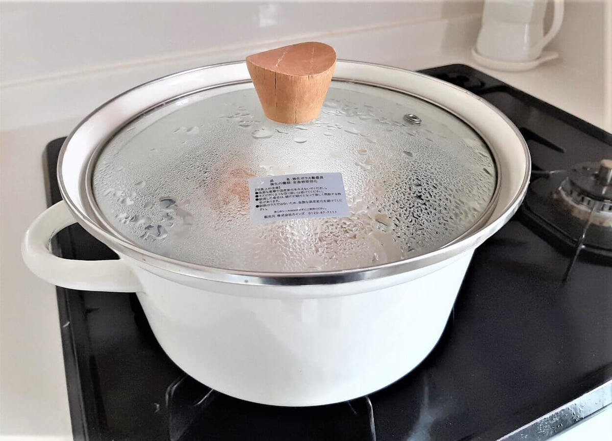 沸騰したお湯を入れたら、そのまま弱火~中火で30分湯煎します。その後は10分ほど蒸らしたら完成!