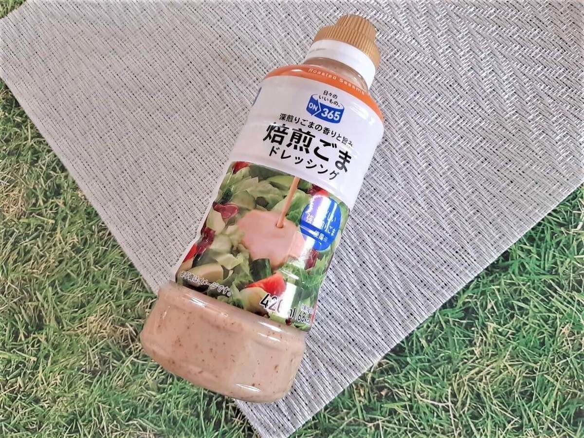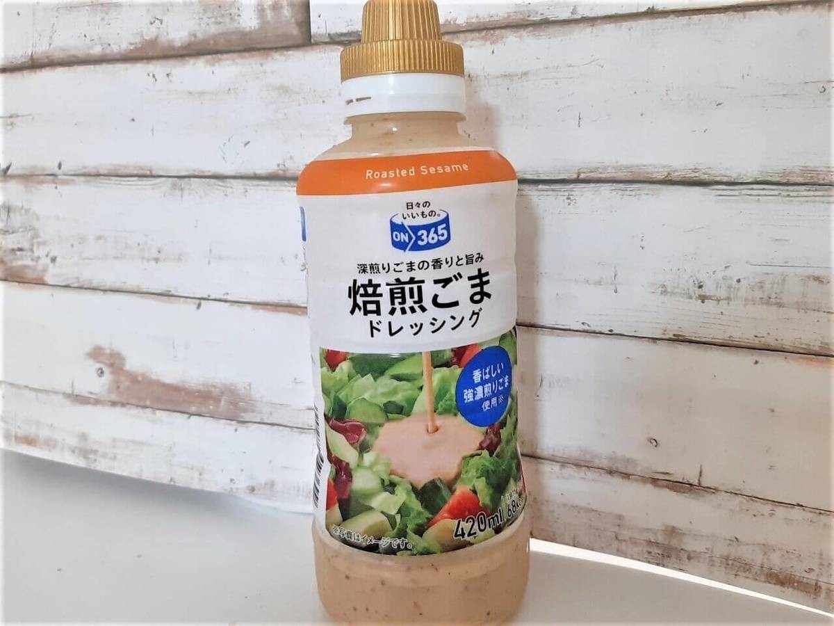コスモスのオリジナルブランドの「on365」の商品です。ドレッシングは種類が多く、ごまドレのほかに「和風ゆずごま」「黒酢たまねぎ」「シーザーサラダ」「和風」などが並んでいます。