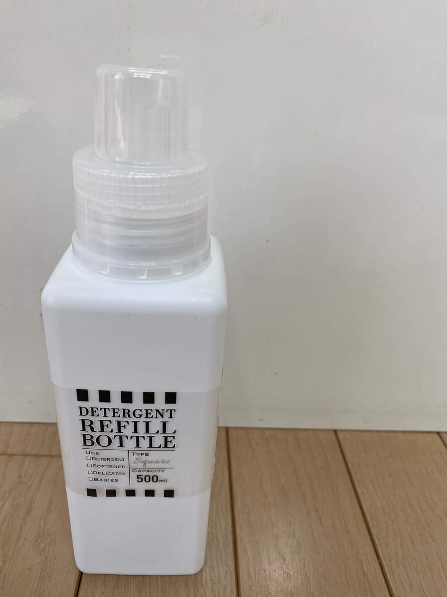 わが家も、洗濯洗剤はメーカーパッケージにどうも馴染めず、この白いボトルに詰め替えています。