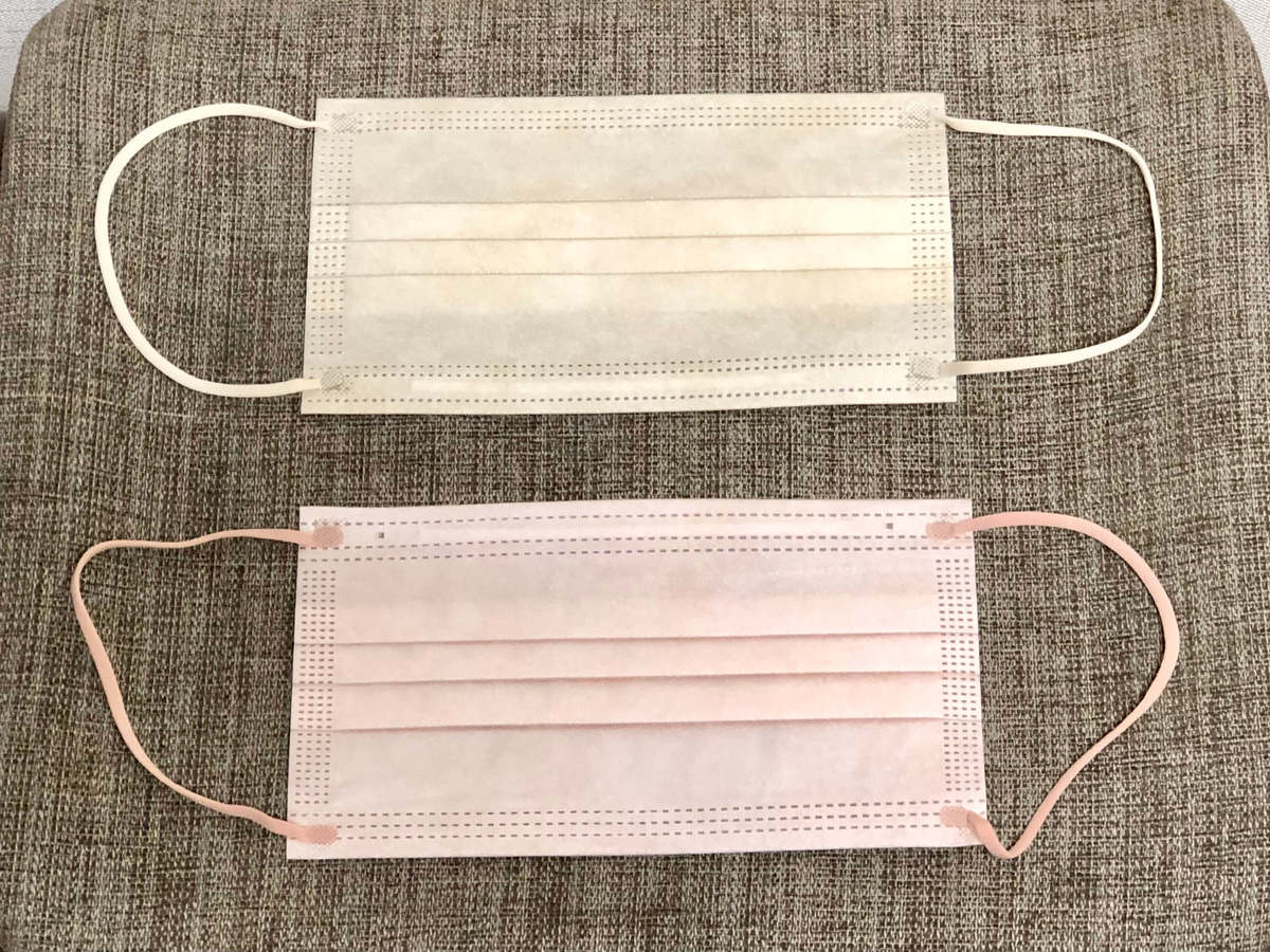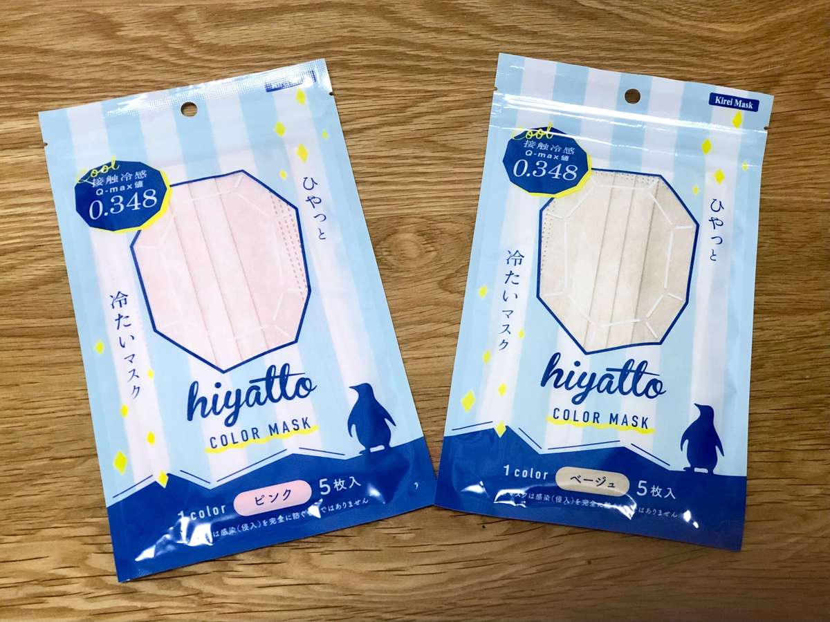 - ヒヤット カラーマスク(接触冷感不織布マスク)5枚入り 左ピンク、右ベージュ(各110円・税込)