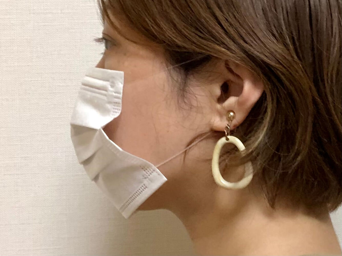 なによりマスクの紐部分が透明なので、イヤリングが目立つ! ピアスやイヤリングを目立たせる意図は、ダイソーさんにはないでしょうが、私はイヤリングが映える点が一番気に入っています。