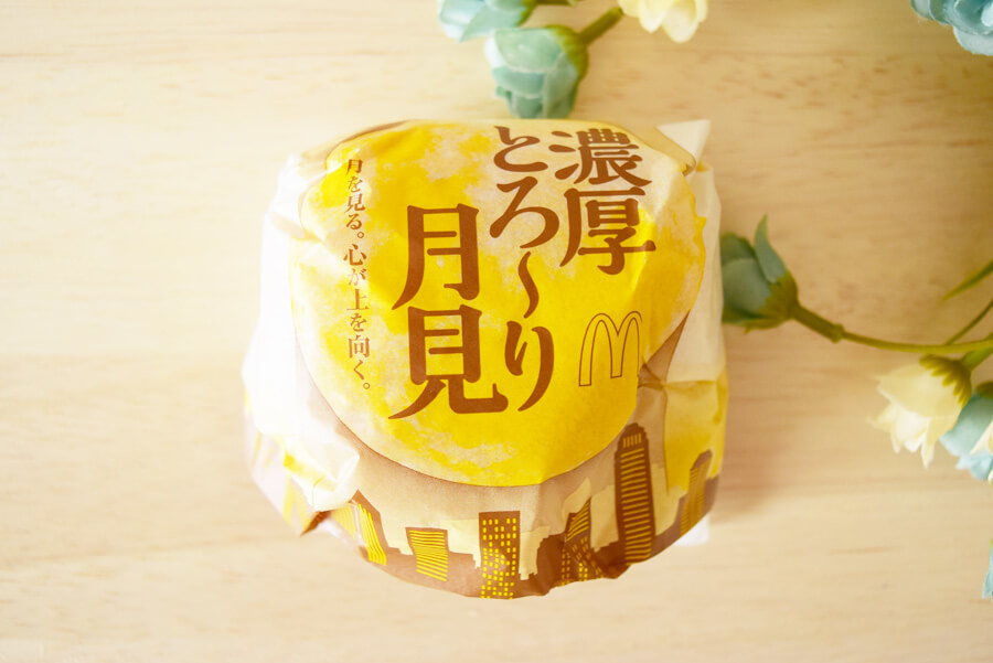 濃厚なチーズソースが存分に味わえるのだという、マクドナルド「濃厚とろ~り月見」420円(税込)。月見を意識した素敵な紙包を見るだけで、テンションが上がります。