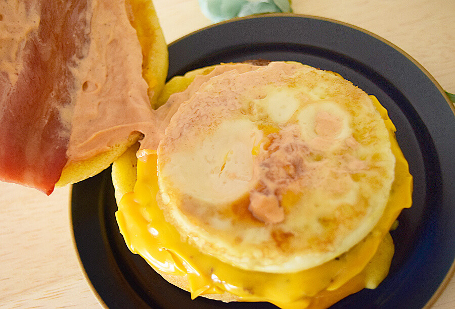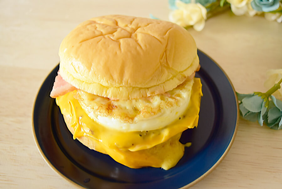 タマゴに100%ビーフパティ、スモークベーコン、どろどろのチーズソースがサンドされていて、トマト風味のトマトクリーミーソースで味付けされています。