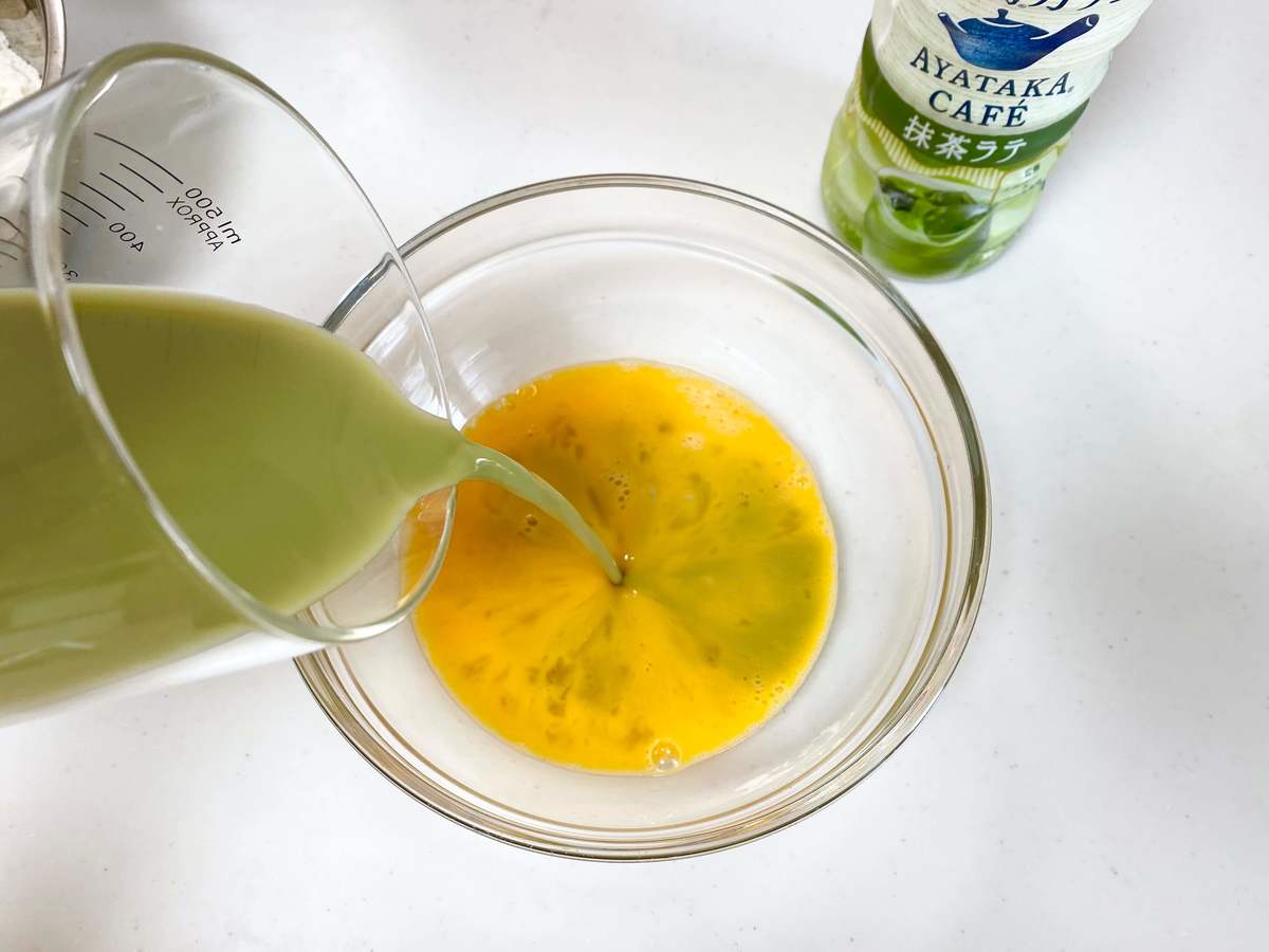 ボウルに抹茶ラテ、卵を入れて混ぜておきます!
