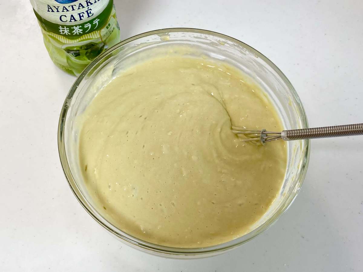抹茶パンケーキ作り方①抹茶ラテ、卵、ホットケーキミックスを混ぜる
