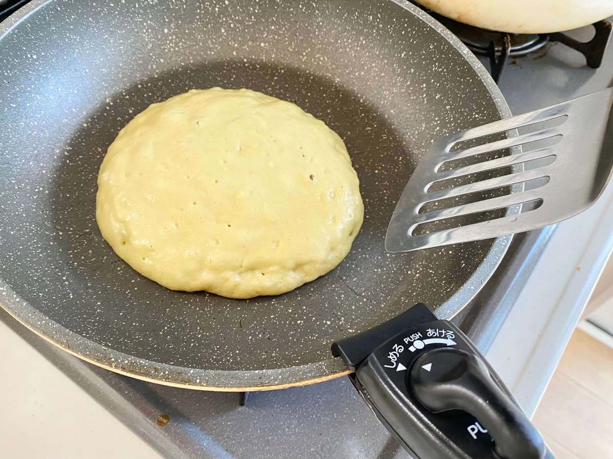 裏返し、さらに2分ほど焼いたら抹茶パンケーキの出来上がり!