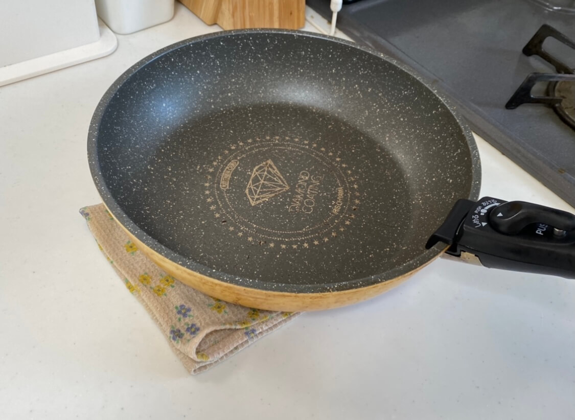 フライパンを中火にかけ1分ほど熱したら、1度濡れ布巾の上にのせて30秒ほど冷まします。