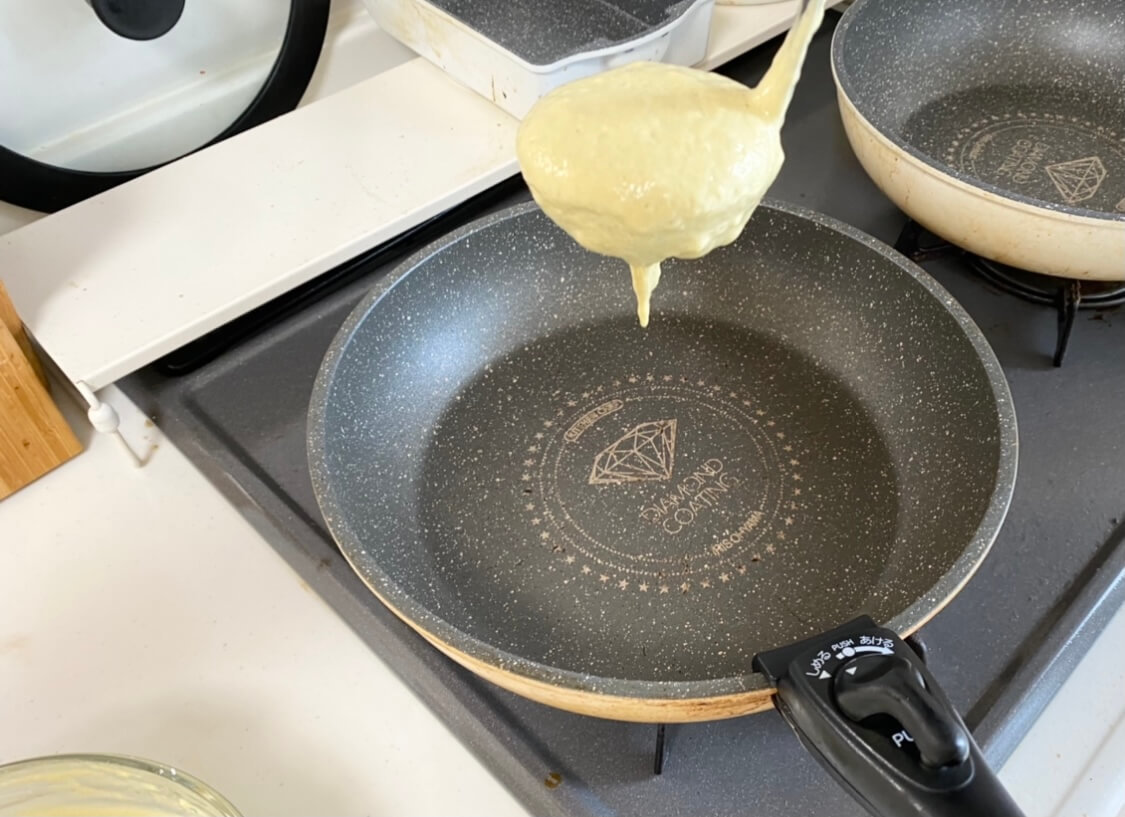 フフライパンを再び弱火で熱し、少し高めの位置から生地を落とすイメージで流し入れていきます。