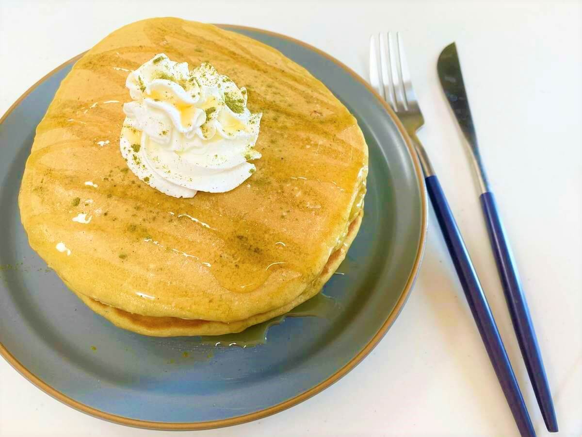 出来上がった抹茶パンケーキを重ね、好みでシロップと抹茶パウダー、ホイップクリームをトッピングしてみました。