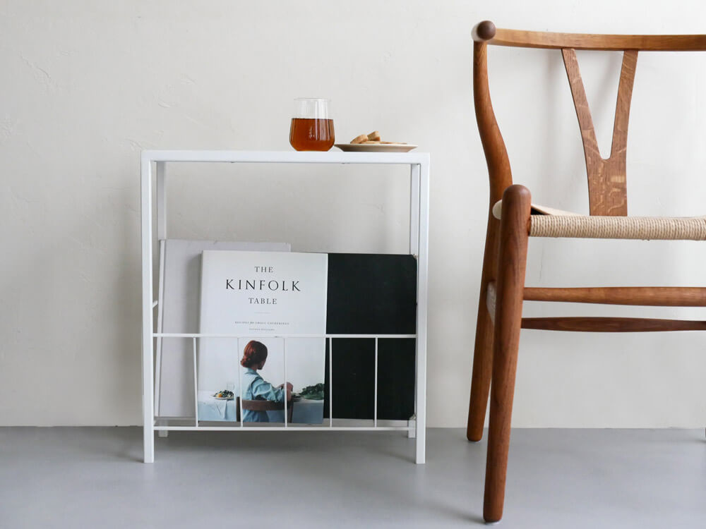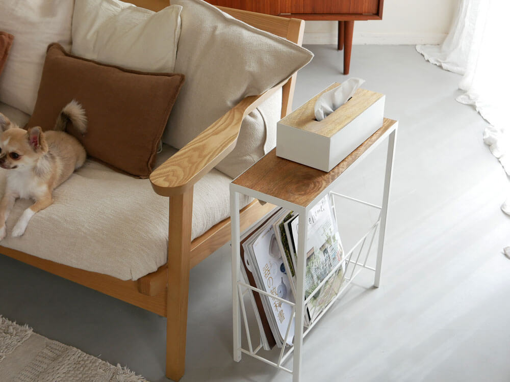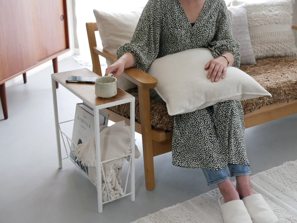 次にご紹介するのは、ドリンクや本などを置くのに、ソファ横にあると便利な「マガジンラック」。 読みかけの雑誌や本、ブランケットを入れられ、天板にはドリンクやリモコンなど、くつろぐ空間に必須なアイテムを上品に収めてくれますよ。