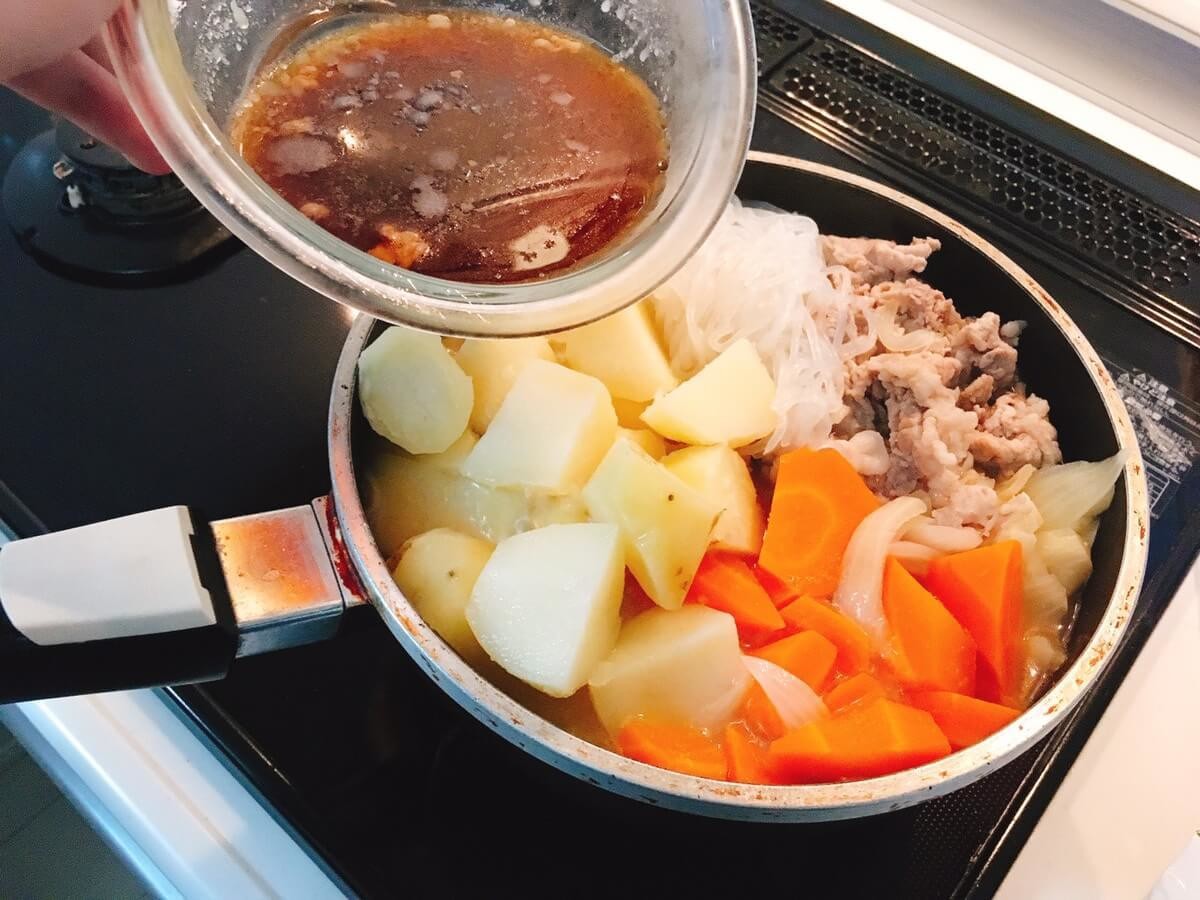 豚肉と玉ねぎを炒めたら、レンチンしたにんじんとじゃがいも、しらたきなどを投入!水でさっと煮るだけ。つゆ、しょうゆ、みりんを入れて、さらに味がしみ込むまで、5分ほど煮れば完成です。