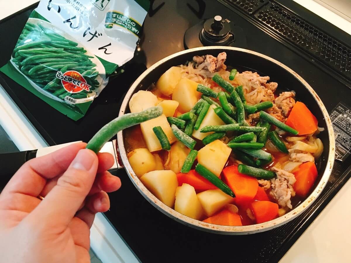 最後に冷凍いんげんを手で折って散らせば、あっという間に肉じゃがの完成です♪