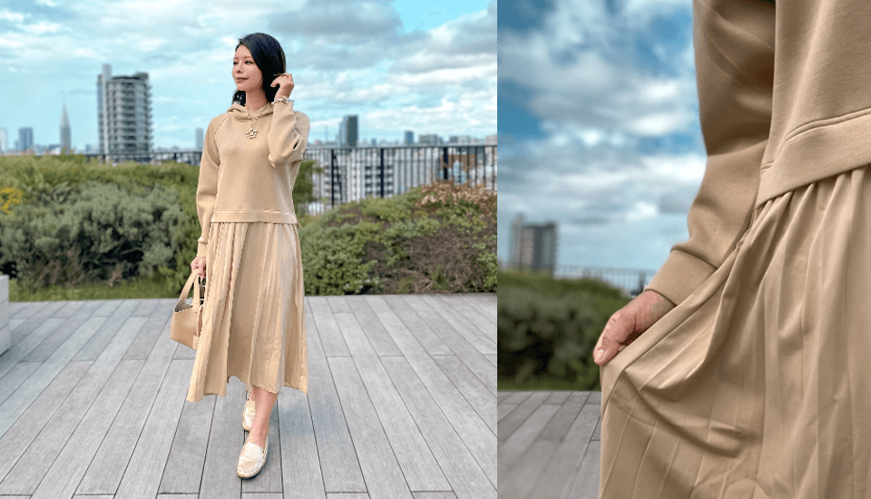 久々の友人と会えるから、やっぱり「高見え」を意識したいです。今回は、大人カラーのベージュでまとめた上品なグラデーションコーデにしてみました。1枚で着てもサマになる「テックスウェットドッキングワンピース」は、プリーツの動きも軽いので、しっかり見えするのにリラックス!