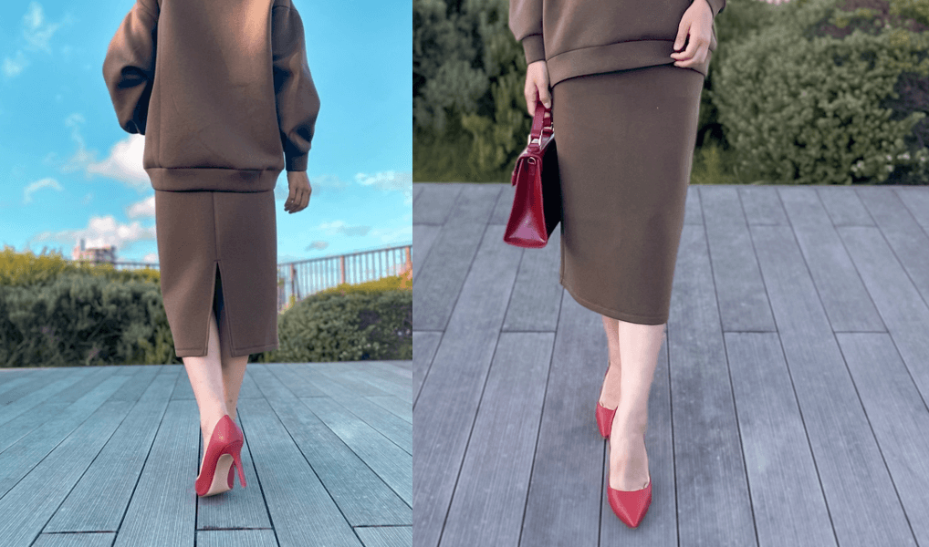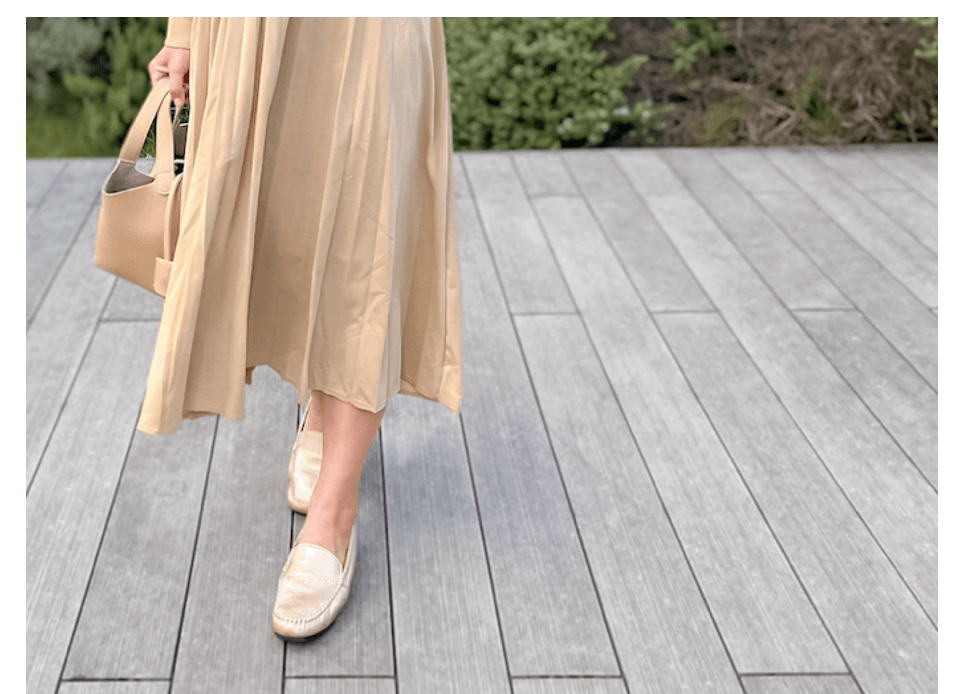 グラデーションは、ただ色を同じトーンに揃えるだけでなく、艶のあるアイテムを合わせることで上品さがアップします。ホワイトゴールドのローファー、ベージュの革バッグ、ゴールドのピアスで、素材を変えながら色のトーンをまとめました。