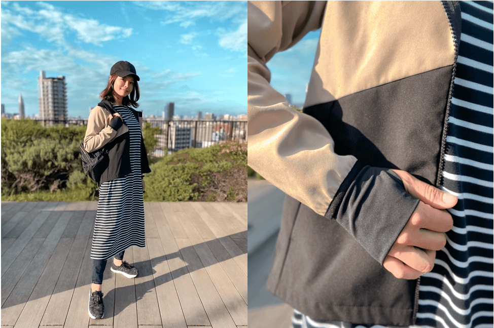 秋雨の降る肌寒い日や、朝夕の寒暖差にも対応できるようにサッと羽織れる「SMART プロテクトジャケット」を合わせました。最近は、使いまわしやすいシックな2トーンの切り替えジャケットを持って出かけます。