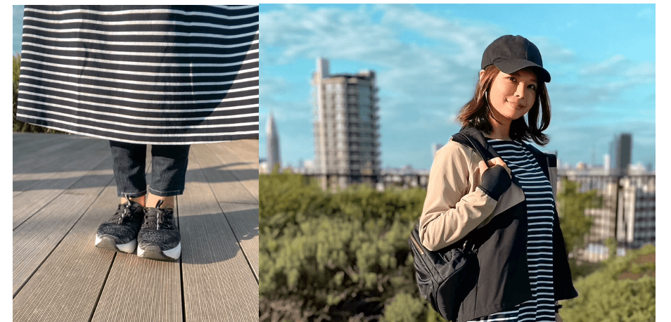 レギンス、スニーカー、ショルダーバッグで動きやすさを重視しました。子どもと一緒のときは、両手をふさぎたくないので軽めのショルダーバッグがおすすめです。黒のラインも映えるので、このデザインを邪魔しないよう重ね着をせずスッキリとまとめています。