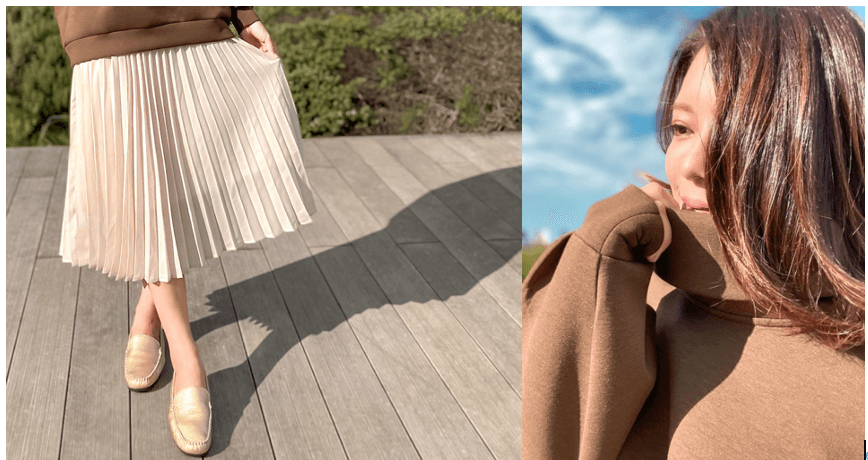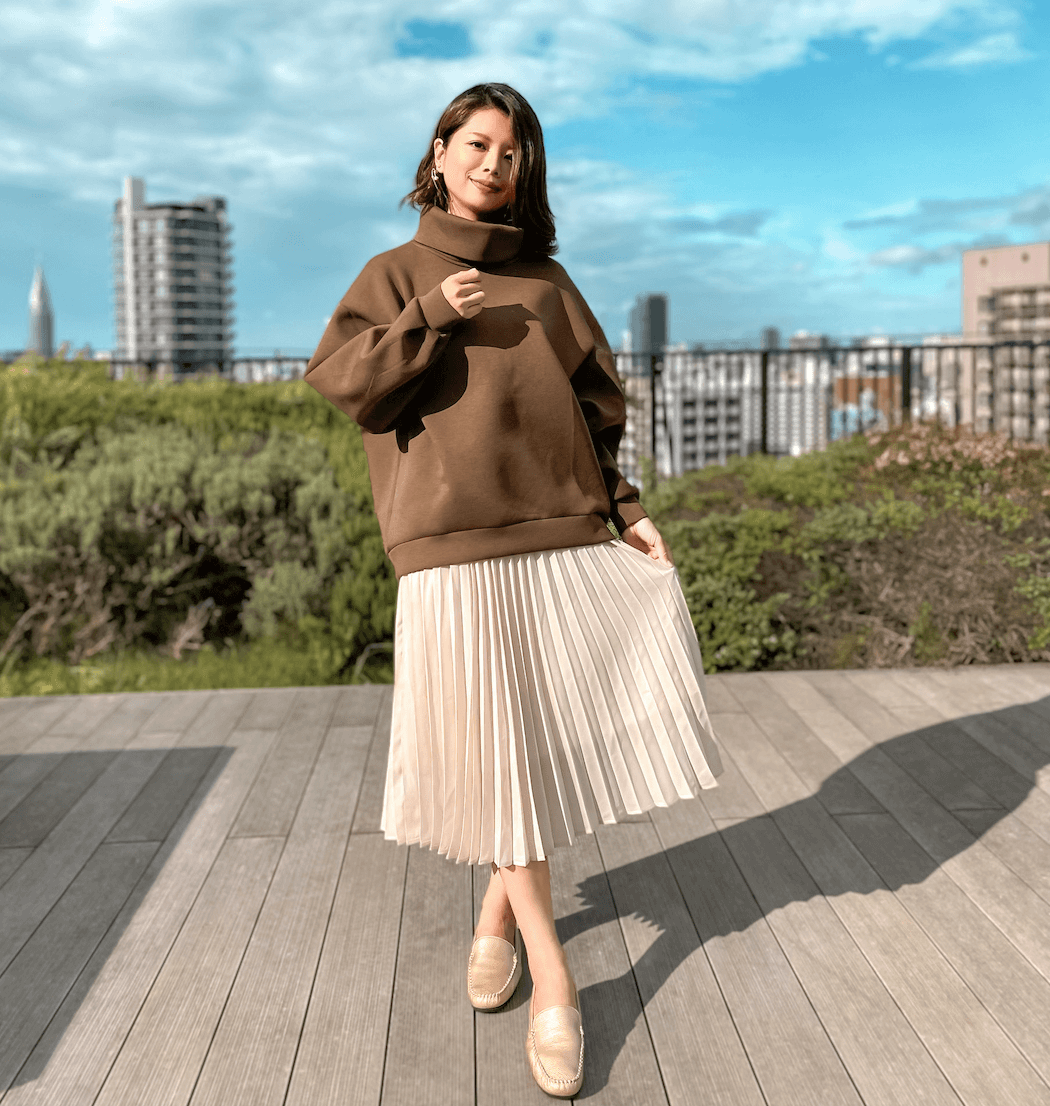 一気に秋冬っぽさが出せるブラウン色に、やわらかなホワイトのプリーツスカートを合わせて上品な抜け感を作りました。