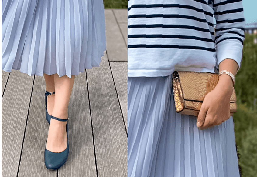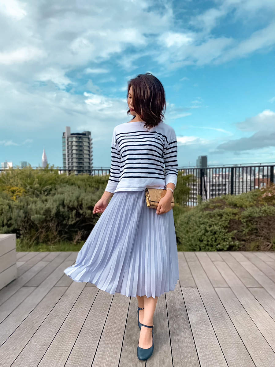 王道のボーダートップスにプリーツスカートでフェミニンな印象に仕上げました。手持ちのボーダートップス(こちらも「ティゴラ」です)でカジュアルダウンさせて、肩肘張らない印象に。バッグは小ぶりなものをチョイス!