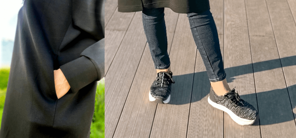 ブラックを引き立たせるため、こだわったのはシックな「色合わせ」です。ジャケットと同系色の、チャコールのスニーカーと、レギンスを合わせ、スポーティに。最近お気に入りのワンマイルスタイルです。