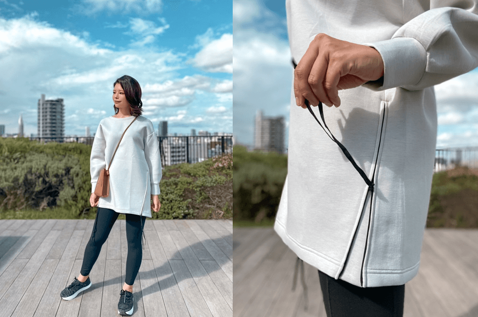 「TECH SWEAT」の素材は、すっきりとしたスポーツ素材の中にフェミニンさがちょうどよく融合していて、大人の着こなしができるのもうれしいポイント。