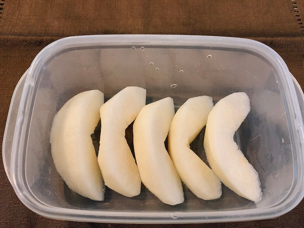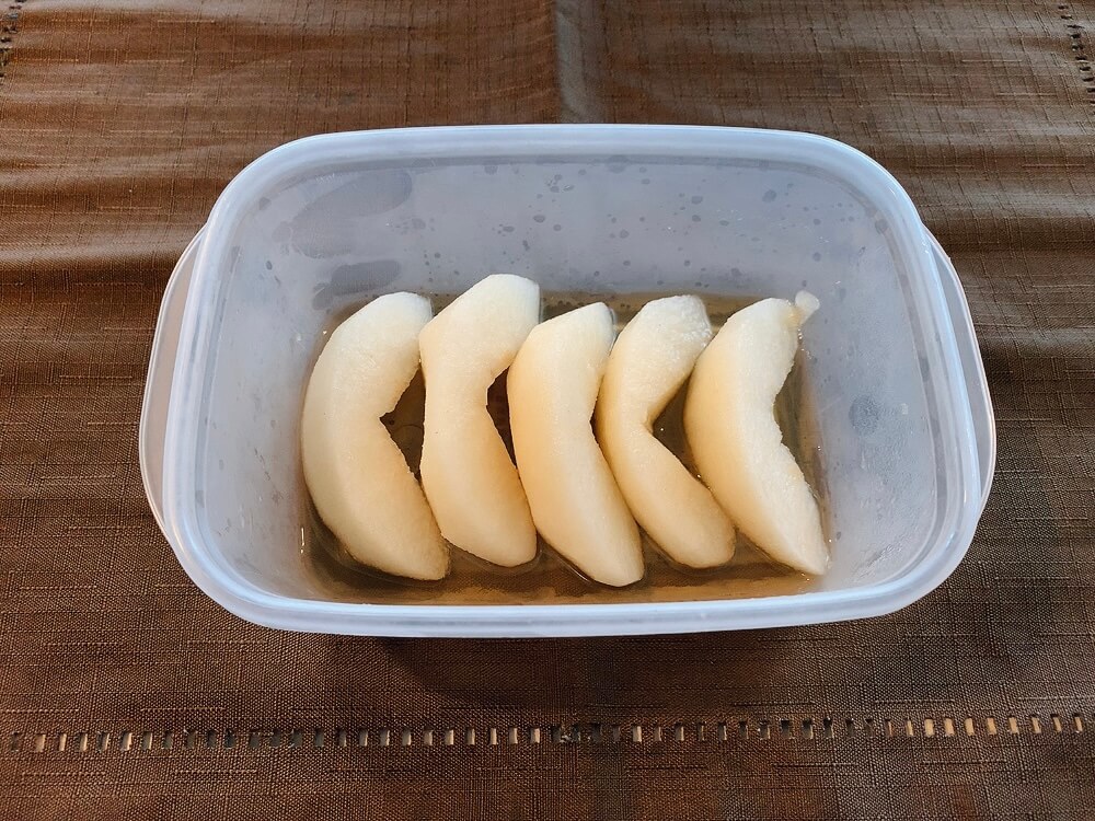 翌朝ワクワクしながら一晩おいた梨を冷蔵室から出しました!よく見ると、梨から水分が出ていますね。これが、とても重要なんです。