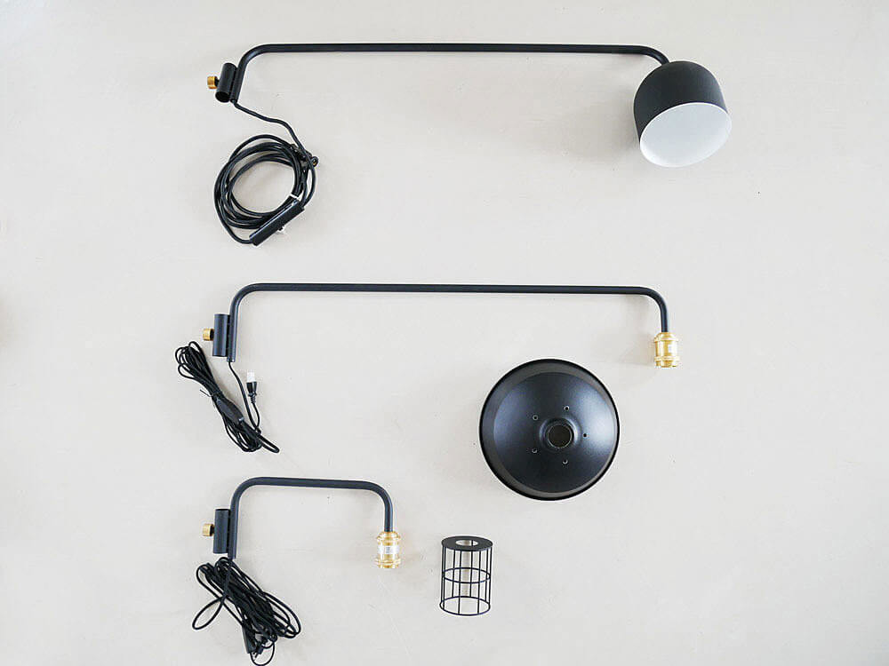上からアームとシェードが一体型の「ランプC」、組み合わせ自由な長さ91.5cmの「アームL」に長さ約38cmの「アームS」 。