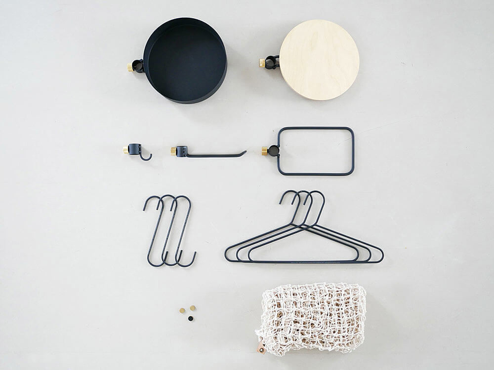 トレイ、テーブル、フック、ロングフック、シューズラック、Sフック(3個セット) 、クローゼットハンガー (3本セット) 、マグネット(3個セット)、ネットの全部で9種類のアクセサリーの中から選べます。