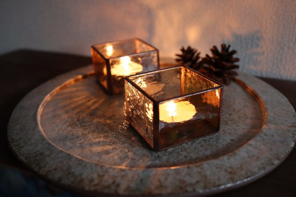 ステンドグラスの楽しみ方のひとつといえば「光の反射」。こちらの作品はキャンドルを灯して、趣のある光の反射を楽しめるキャンドルホルダーです。