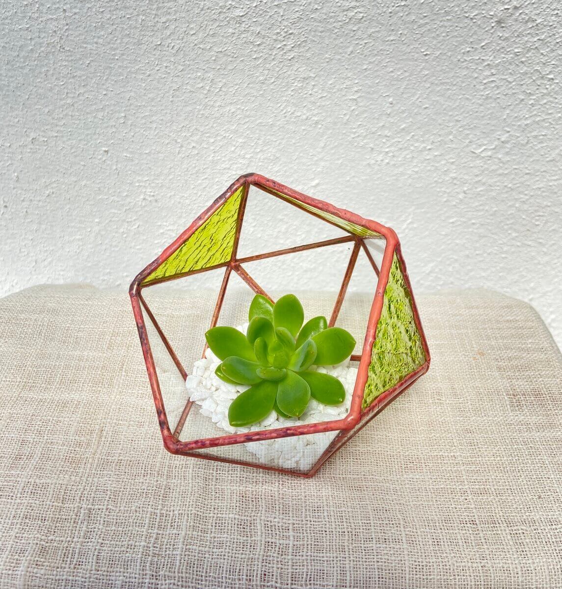 空間に緑を足したいときに使われる植物といえば多肉植物。育てやすさが人気の秘密ですね。そこからさらに、空間映えを求めるなら、こちらのイエローグリーンの多角形テラリウムがおすすめ!