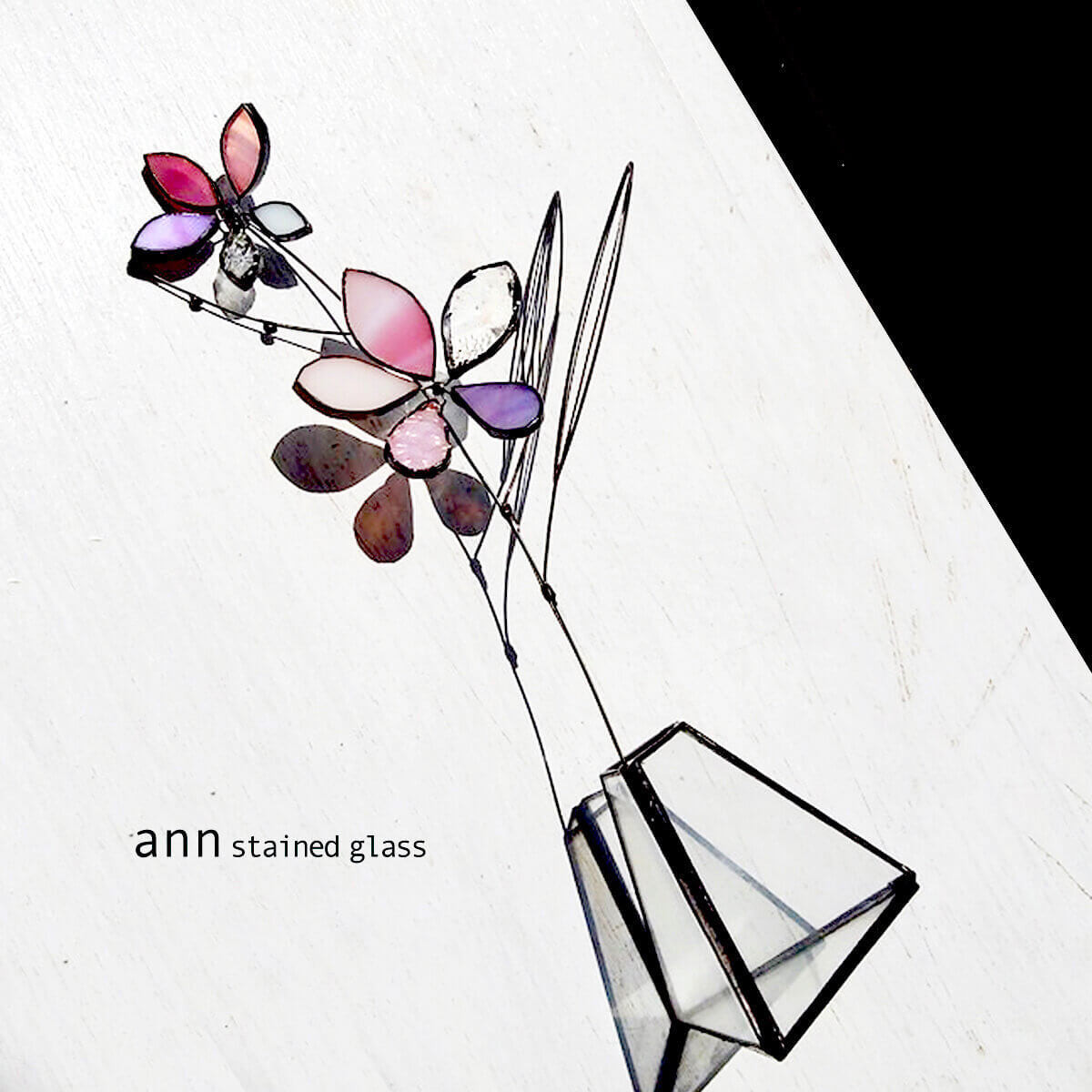 窓際におけばキラキラと輝きとても癒されます。花びら一枚一枚テクスチャがちがうのもステンドグラスだからこそできる技法です。