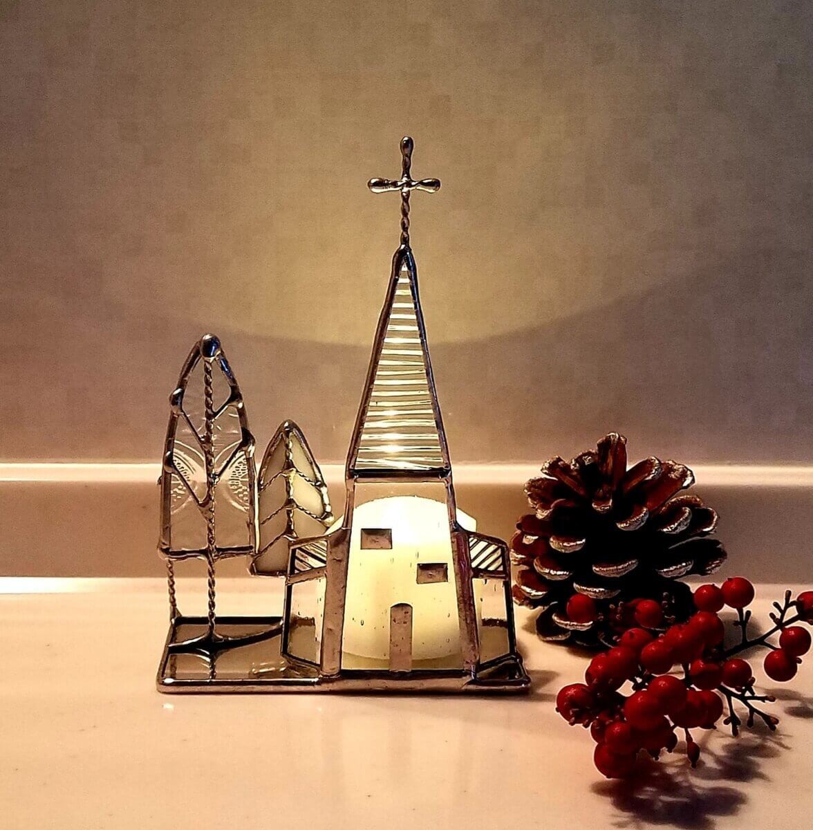 のっぽな教会と雪が積もるもみの木が並んでいるオフジェ。寒くなるこれからの季節に飾りたいステンドグラスです。
