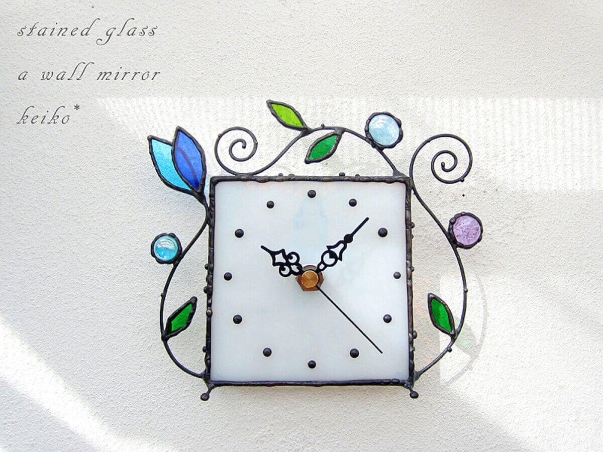 ホワイトな文字盤とボタニカルなモチーフが添えられた、掛け置き両用のステンドグラス時計です。