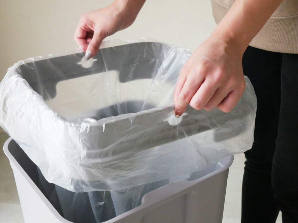 ゴミ袋をセットする部分は「袋クリップホール構造」になっているので、袋をかぶせ、左右にある穴(袋クリップホール)に押し込んで整えるだけ。