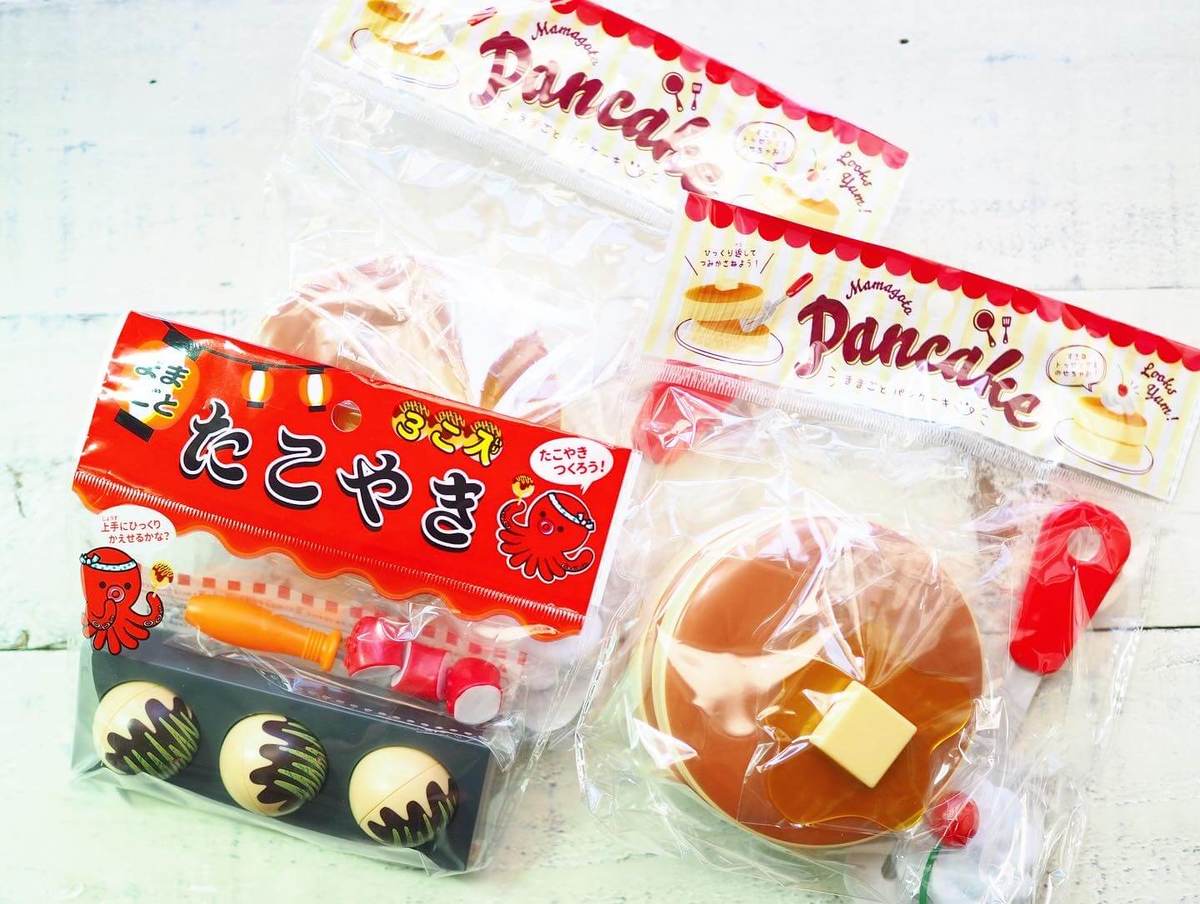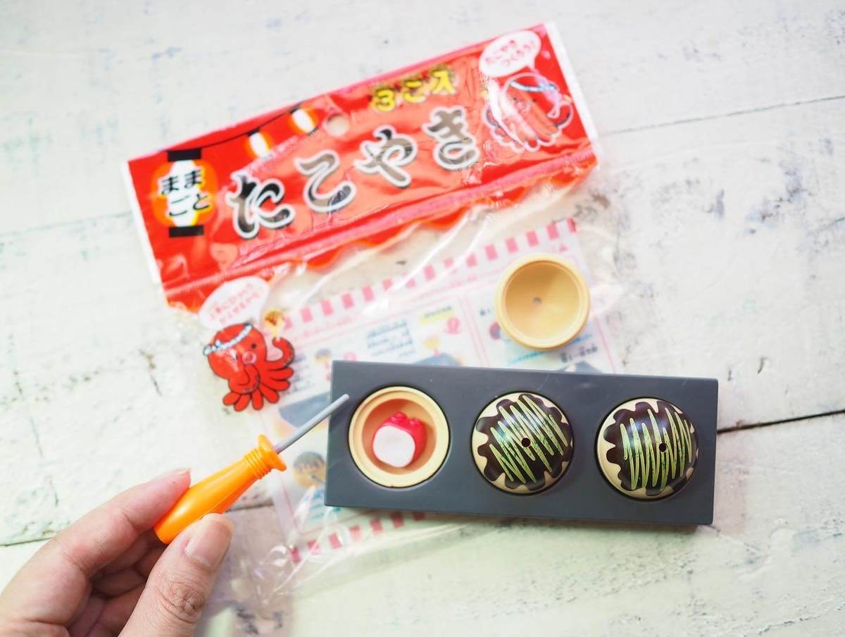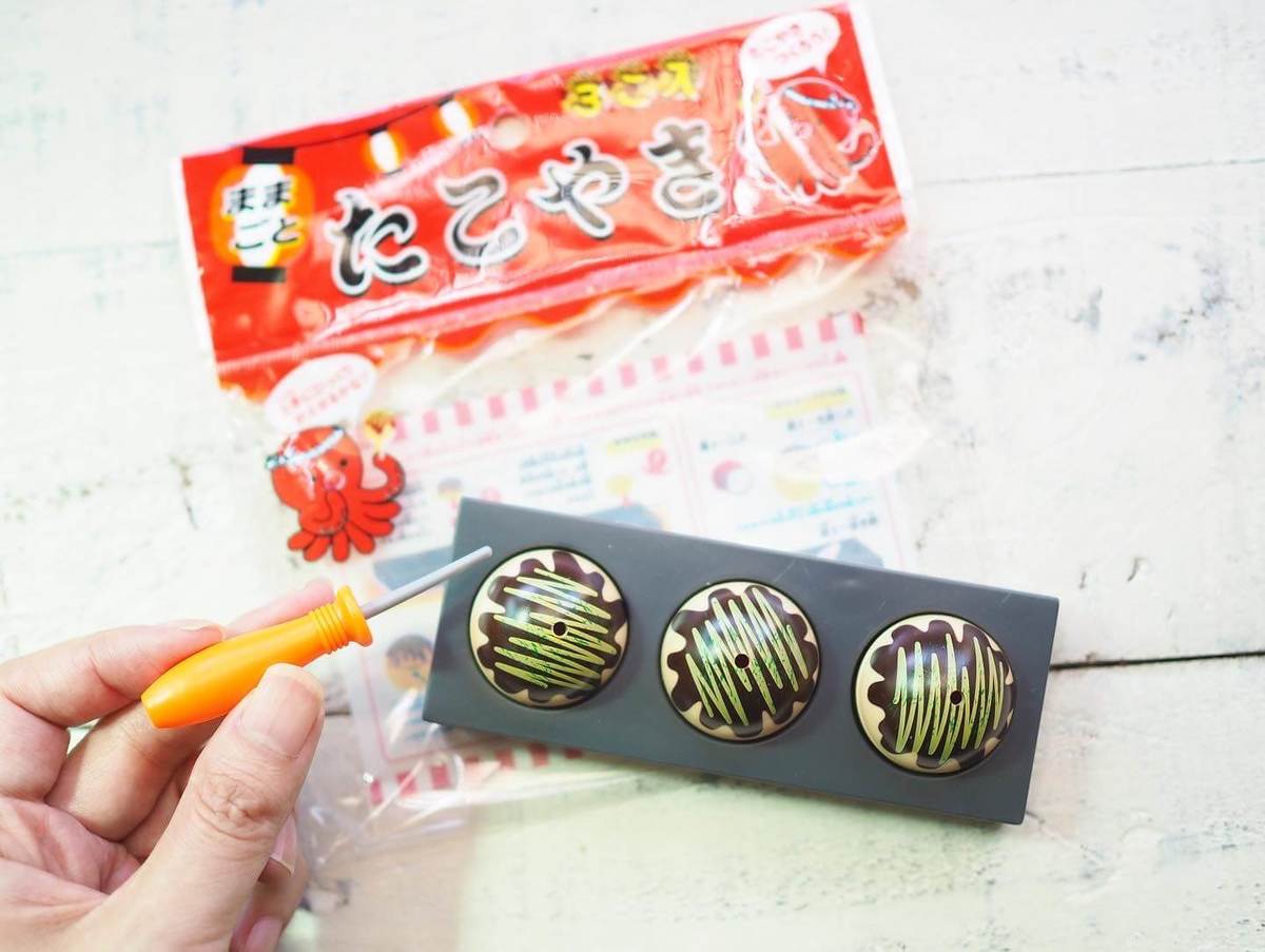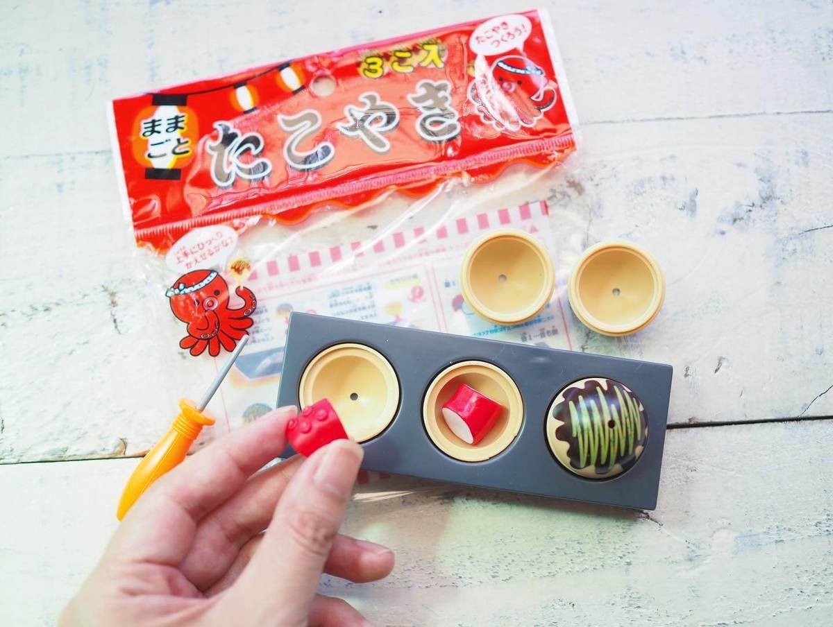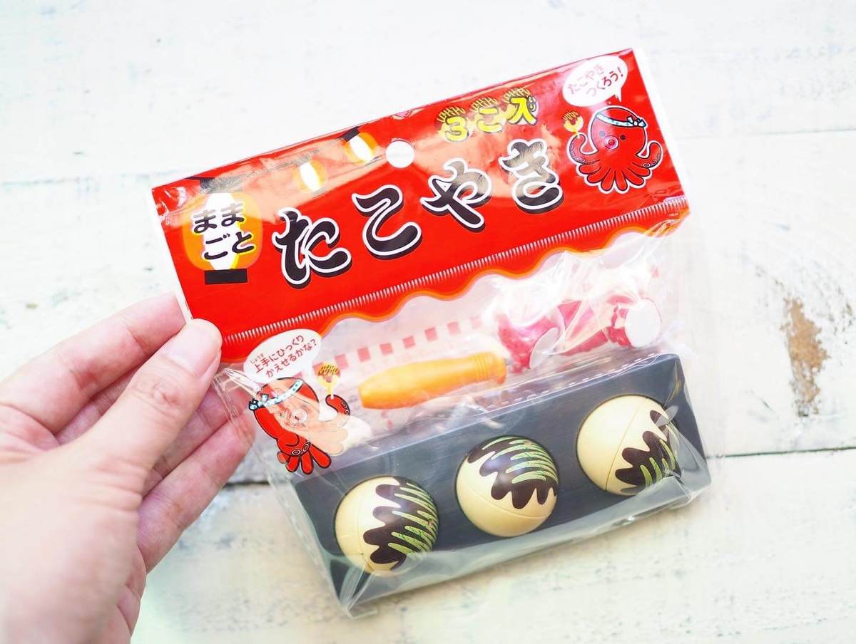 小さなたこ焼きプレートと、たこ焼き3つ、具のタコ、ピックが付いたお得な6点セットで、こちらも110円で買えるのに驚き!