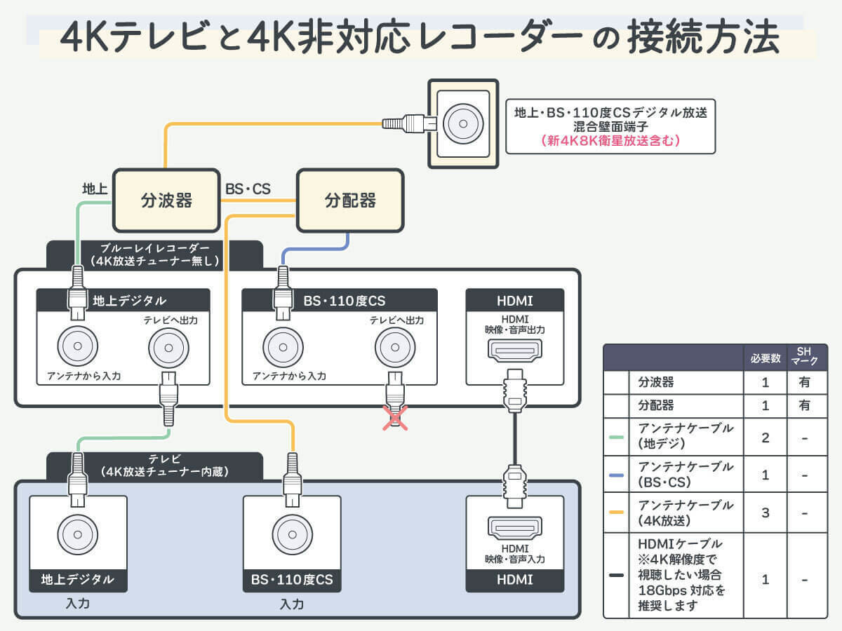 4K液晶テレビと4K非対応レコーダーの配線に必要なモノ