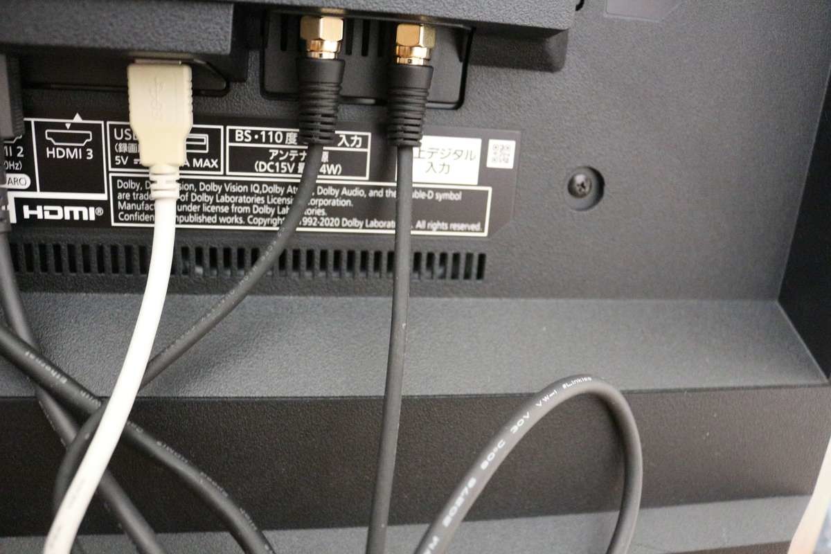 テレビの背面ケーブルはアンテナ線2本(地上・BS)とHDDをつなぐケーブル1本の3本だけになります(コンセントケーブル除く)。