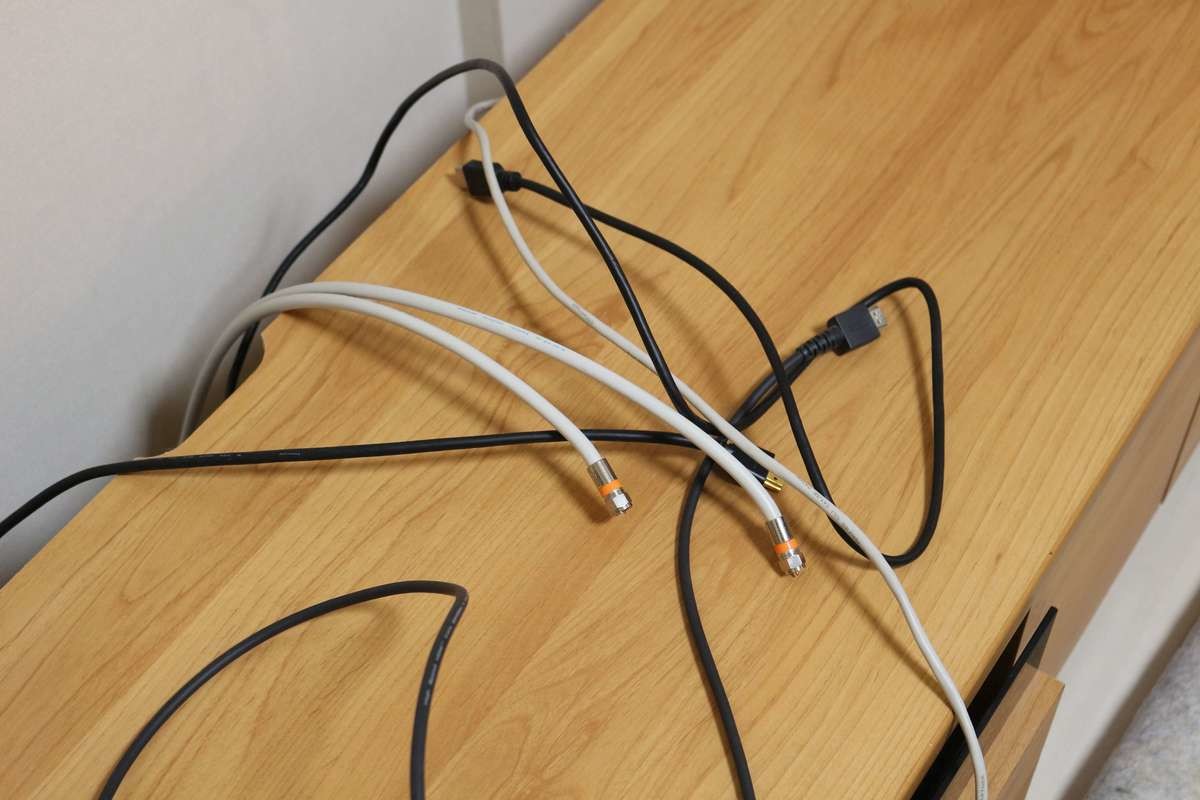 壁面のアンテナ口とテレビやレコーダーが近ければアンテナケーブルは短く(0.5m)細くで【2.5C】で十分です。