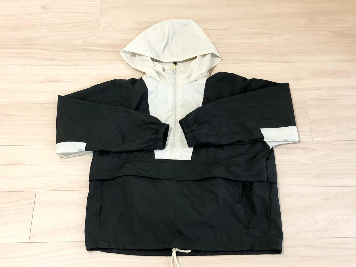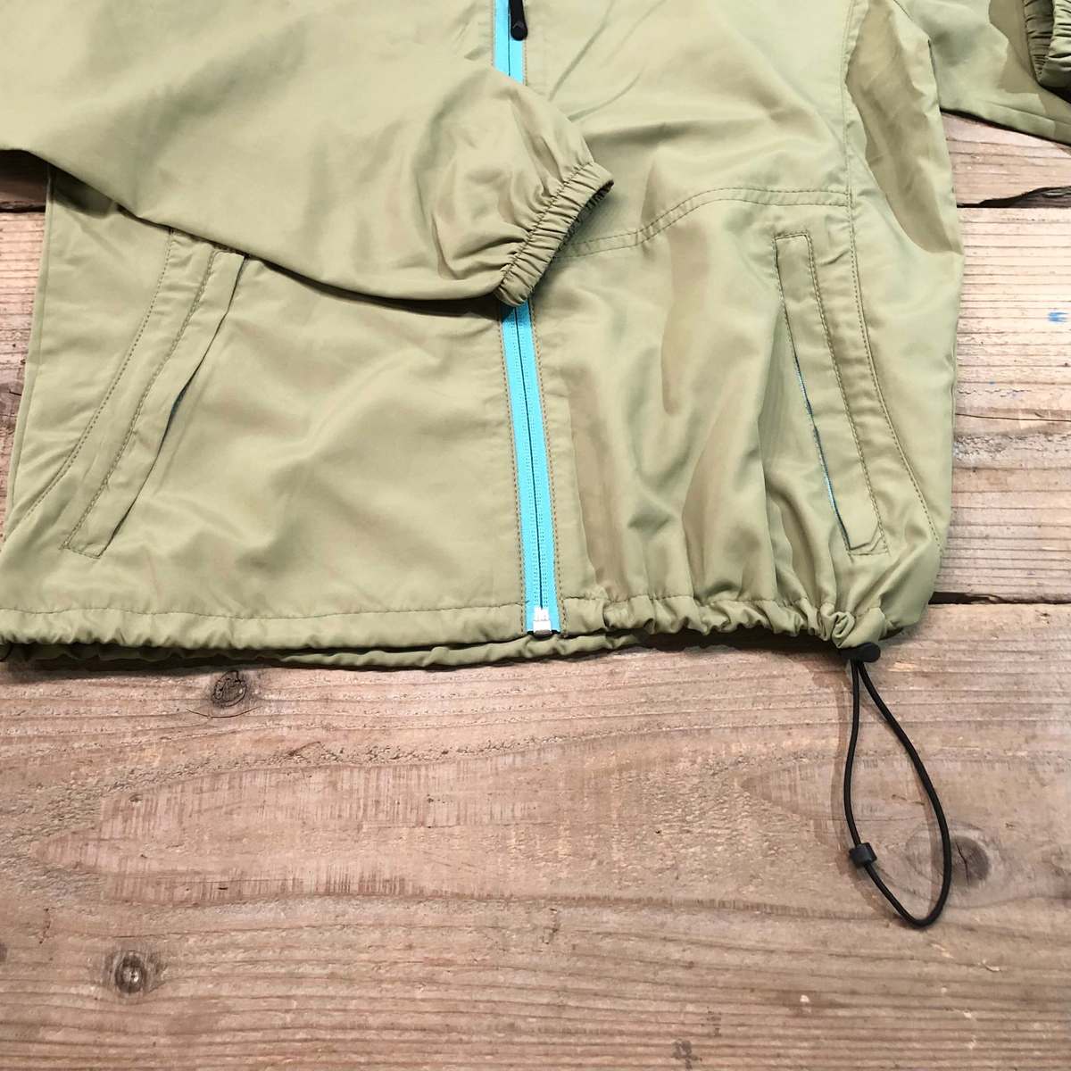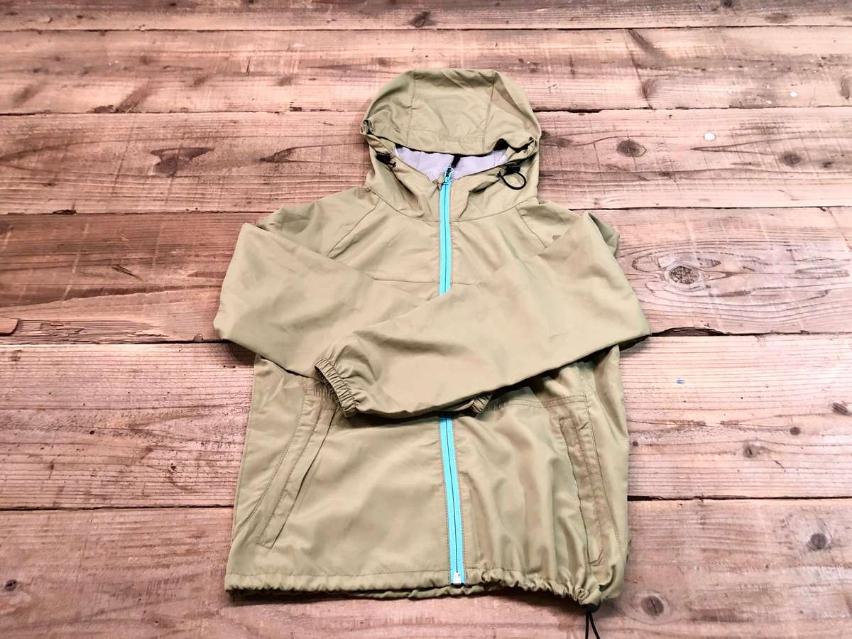 シェルジャケットと同様、軽量で高撥水機能がついています。しかしこちらは、腰から下が大きなポケットになっていて、その分チャックが下まで下がりきらないタイプです。