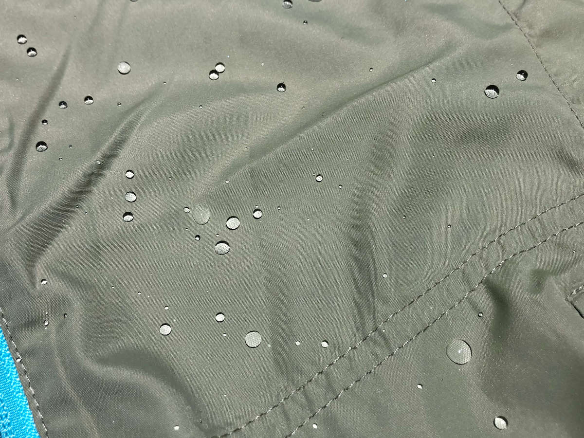 ワークマンといえば、プチプラなのに防水や高撥水アイテムが優れていることで有名です。高撥水シェルジャケットももちろん、水をかけると玉のようにはじき、ころころと生地を滑り落ちていきます。