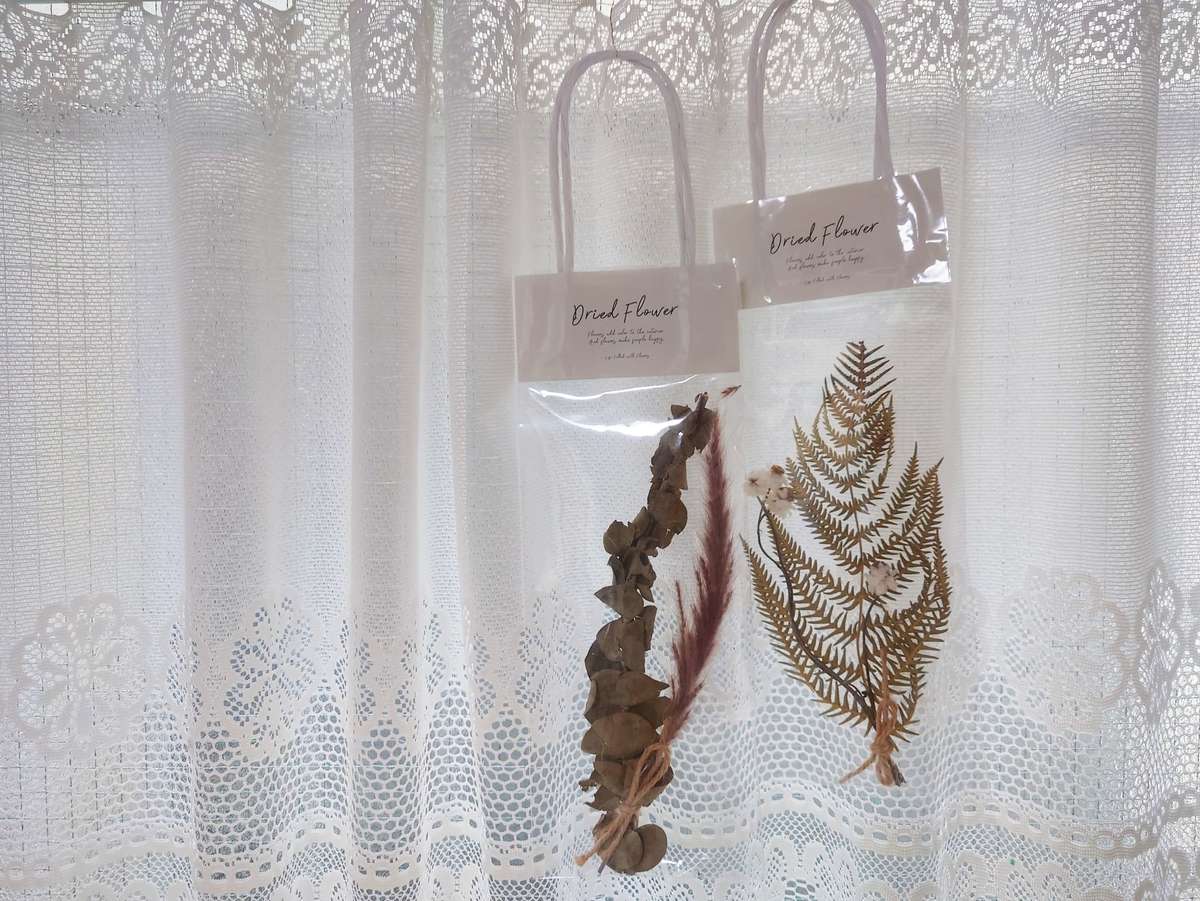ユーカリやシダのドライリーフは、袋のまま飾ってもおしゃれ。