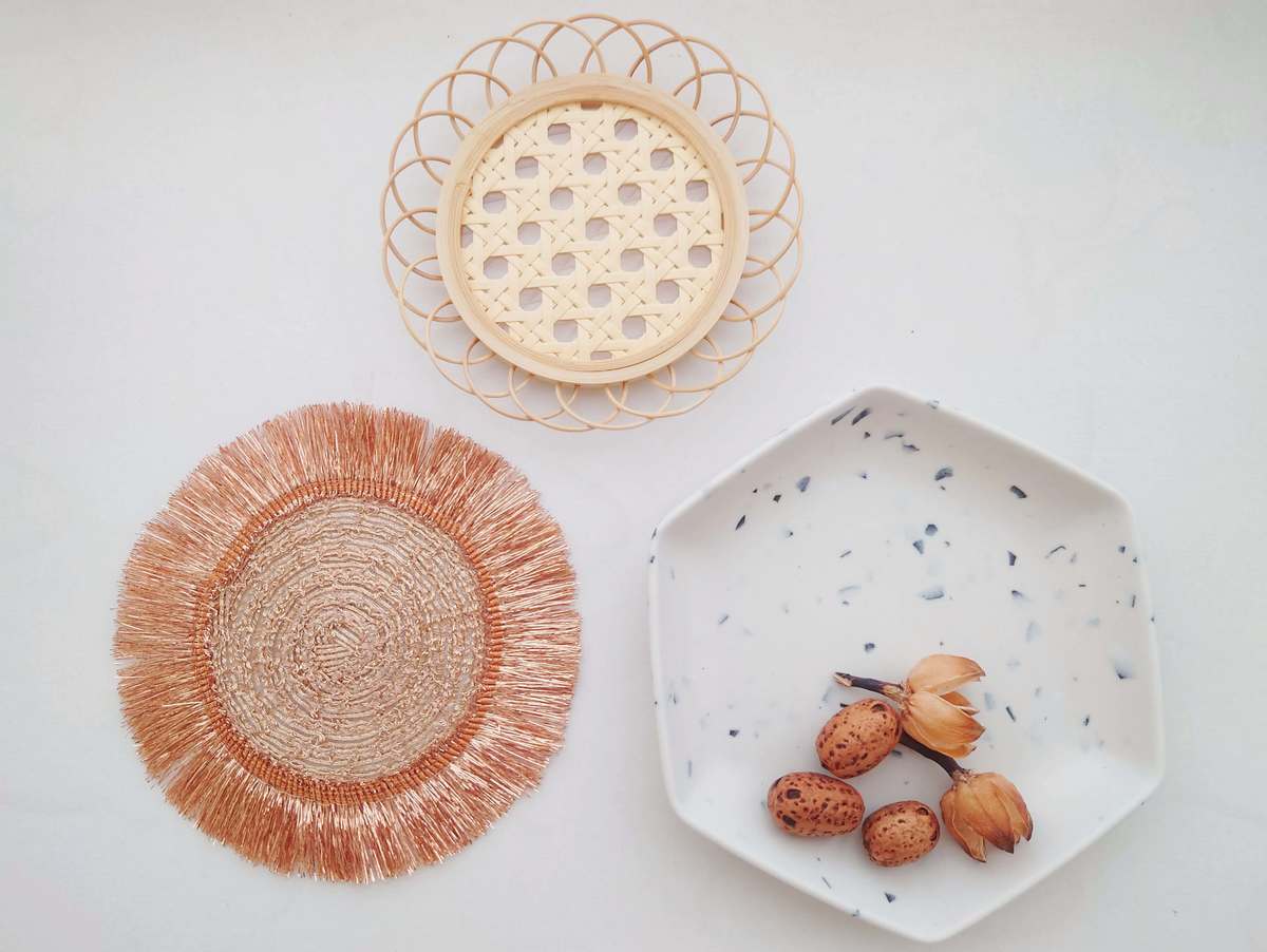 「竹のコースター」や「メラミントレー ハニカム」はアクセサリーや時計を置くのにも便利です。