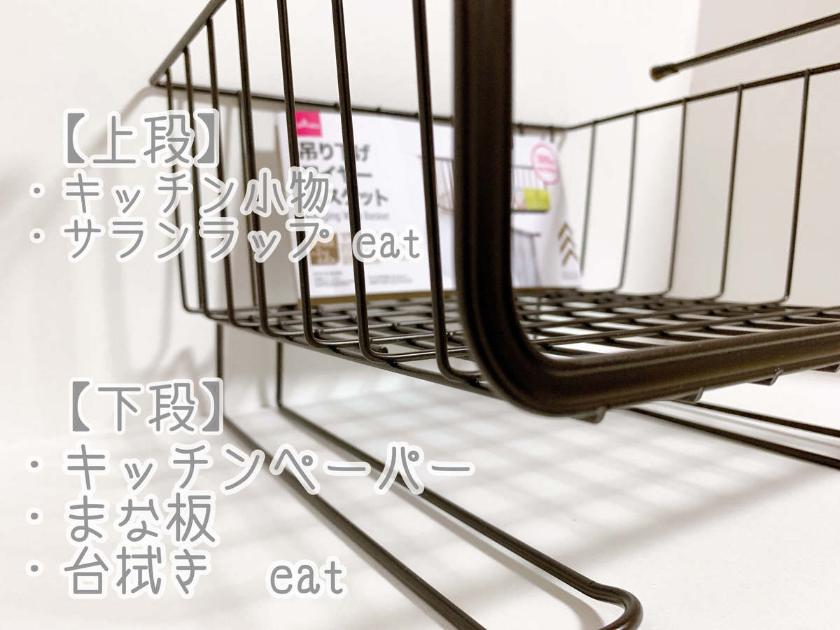 上段は、キッチン小物やサランラップ入れに。私は、厚めのふきんを引いた上に、計量カップやペティ包丁置きとして使ったりしています。