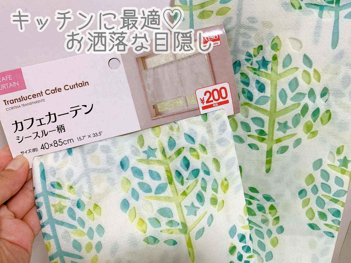 キッチン窓や、収納棚の目隠しにおすすめなのが、シースルーで木の模様がかわいい「カフェカーテン」220円(税込)。