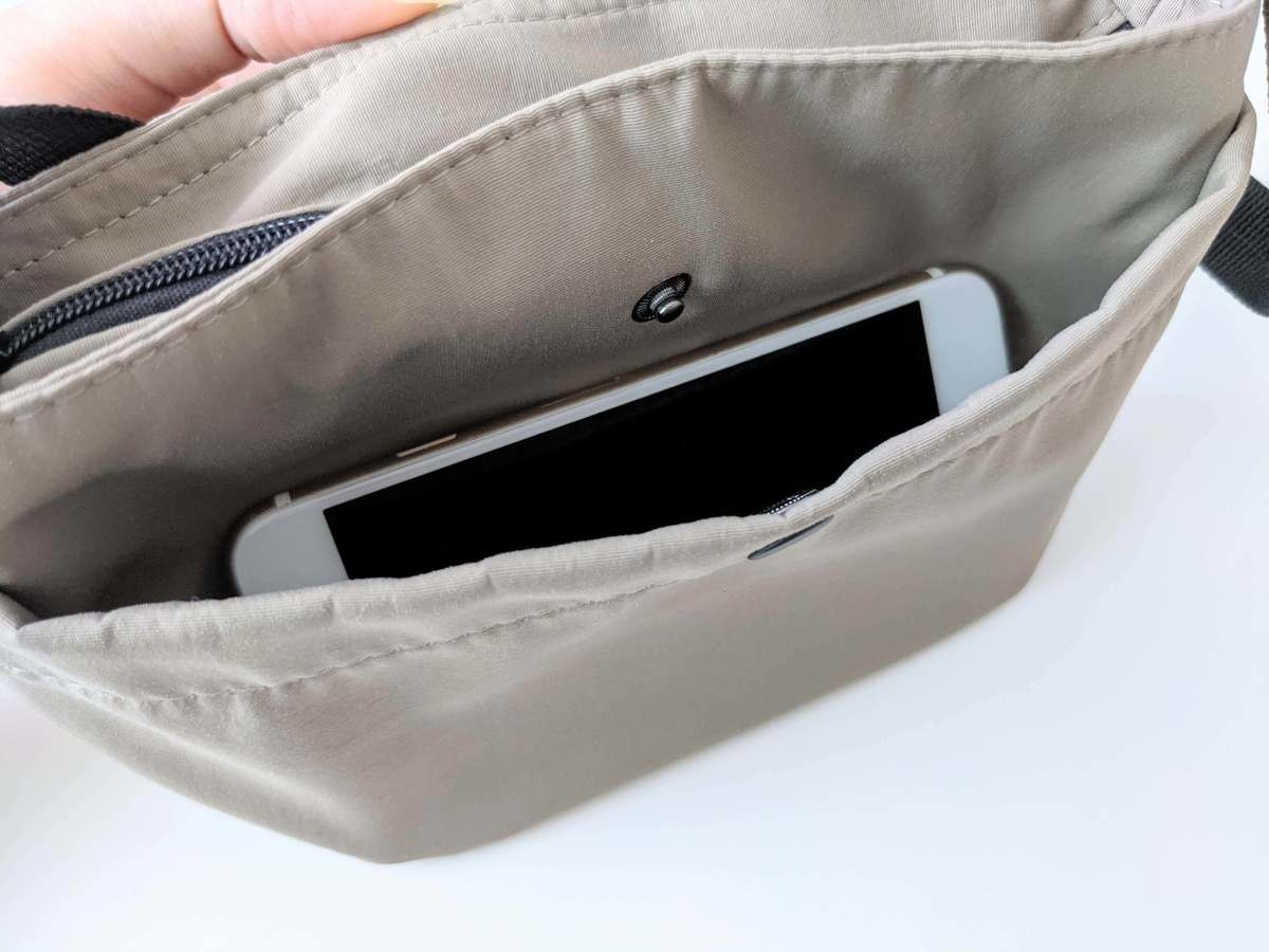 前ポケットには、このようにスマホを入れることもできます。 スナップボタンが付いているため、落下の心配もありません。