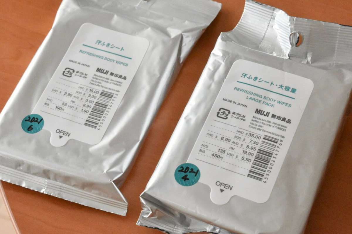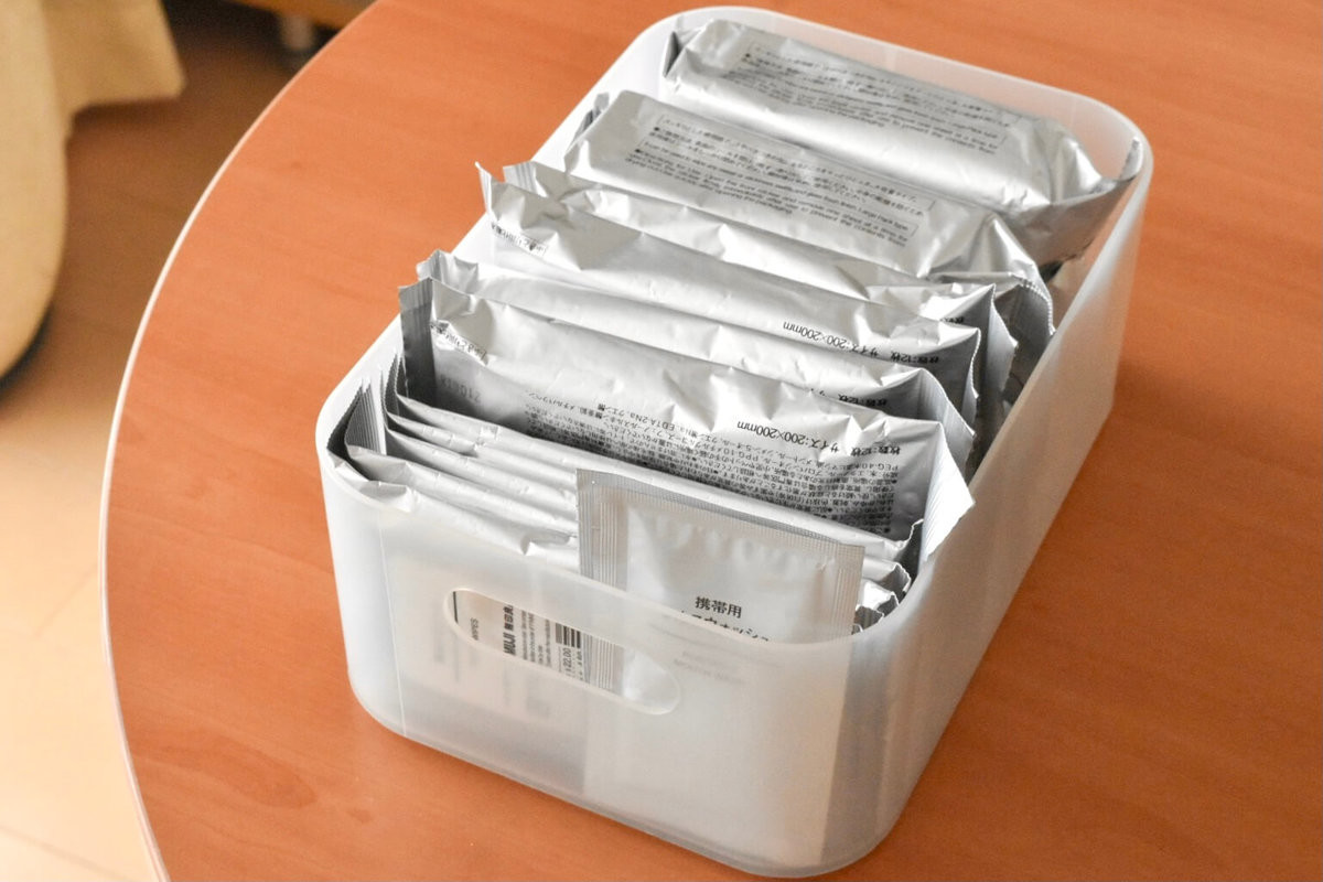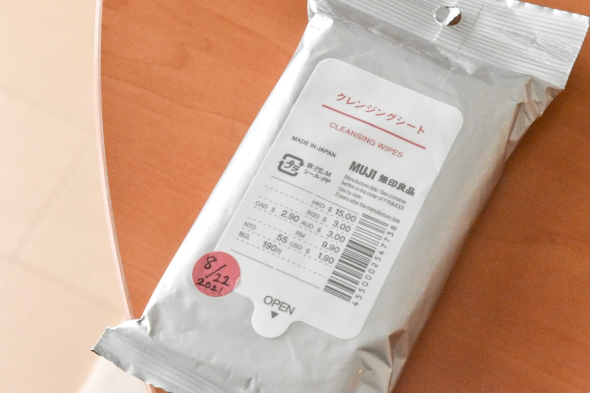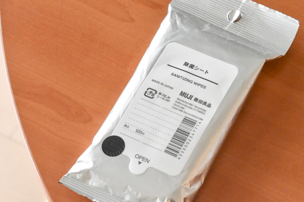 自宅避難用には薬局で購入した大容量のものを備えていますが、家族それぞれの持ち出し袋の中には無印良品の除菌シートを入れています。